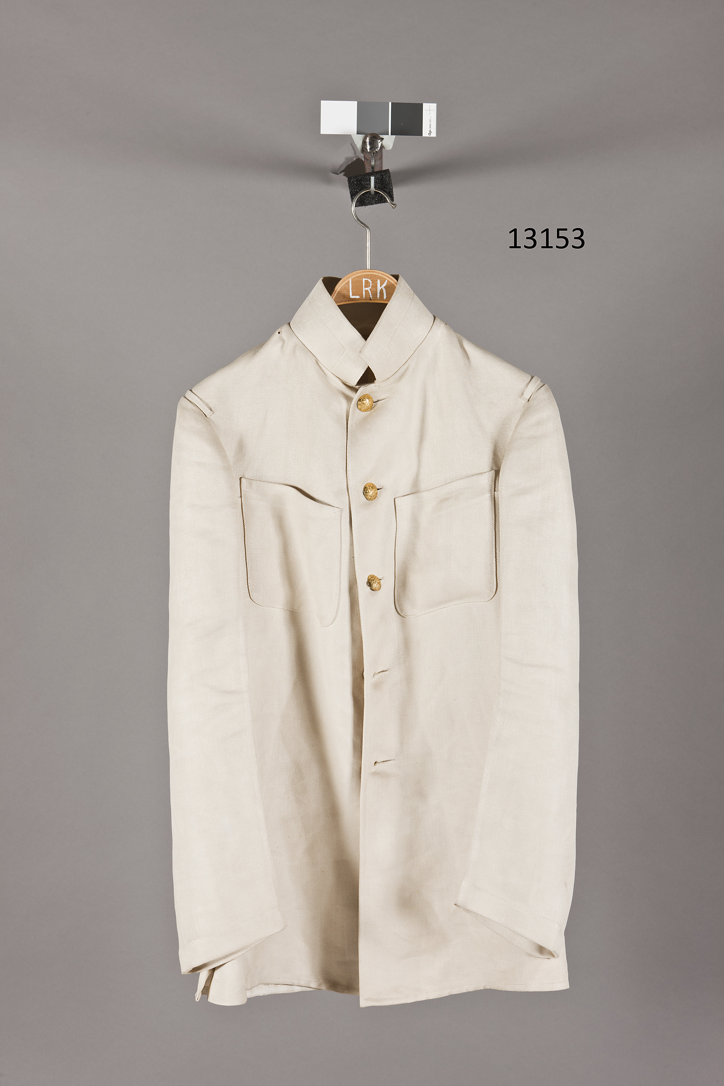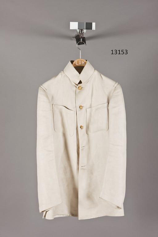 Vapenrock av naturfärgat linne vävt i panamateknik. Ståndkrage, hopfäst med två hyskor och hakar. Enkelknäppt med fem välvda, förgyllda mässingsknappar med rysk dubbelörn i relief. På knappens baksida bl a: "MARKSIM ... // S. PETERSBURG" (med ryska bokstäver). Knapparna fästa på baksidan med en ring i öglan. Rocken sydd i sex våder. I sidorna sprund, l: 130 mm. Isydda raka ärmar. På axlarna tränsar samt hål för klaffar. Två påsydda bröstfickor. Helt ofodrad.
