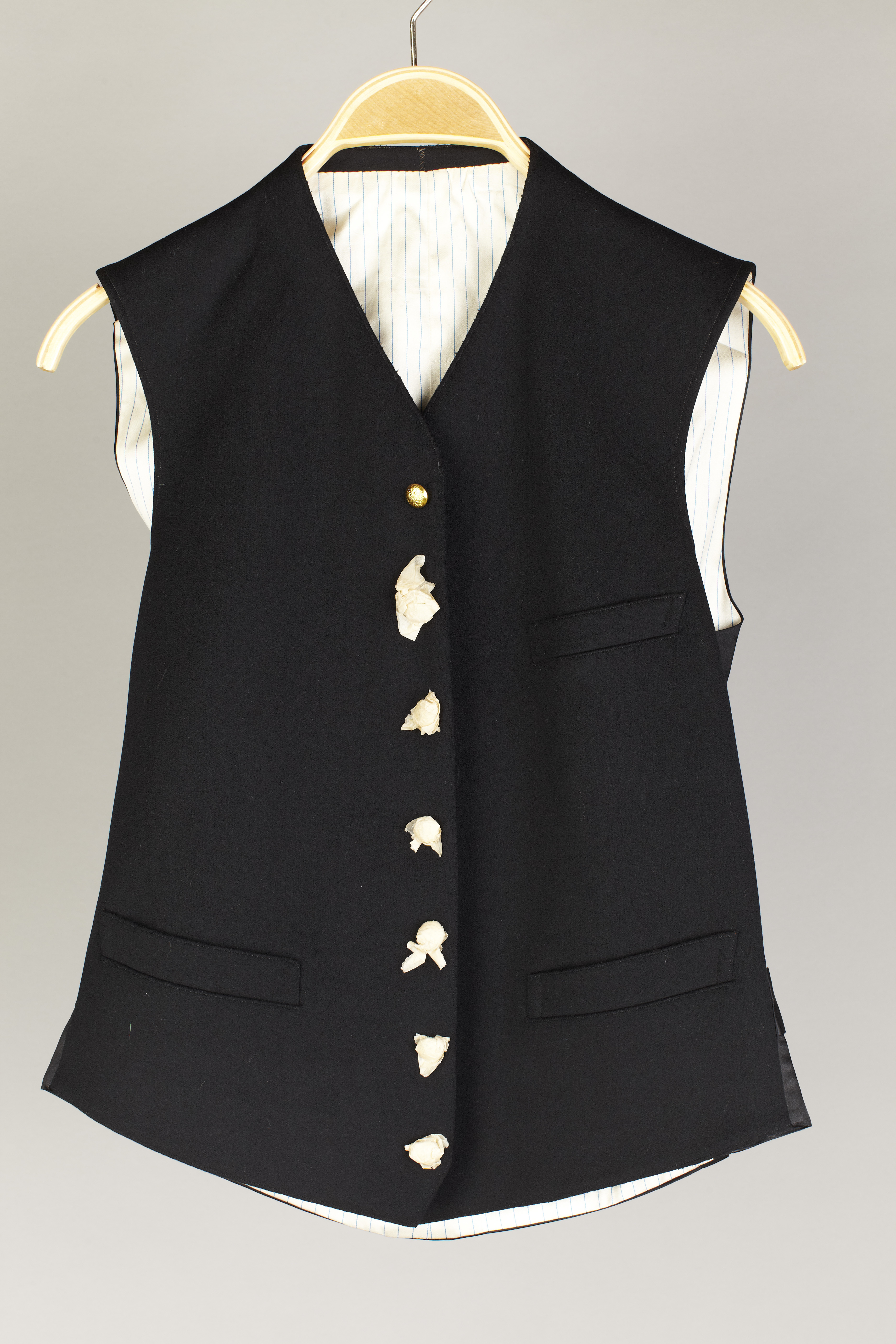 Mörkblå, nästan svart väst av kläde med enkelradig knäppning om sju knappar och åtta knapphål. Knapparna förgyllda, välvda med i relief en krönt dubbelörn med två korslagda ankaren bakom och med i hjärtskölden S:t Georg och draken, d: 14 mm. Två stolpfickor nedtill och en på vänster bröst. Ryggstycke av mörkblå, nästan svart bomullssatäng. Nedtill kilar och spänntampar med mässingssölja. Foder av vit bomullssatäng med smala blå ränder. Gustav V blev rysk amiral 1908. Skänkt av Gustav V:s arvingar, genom Hovmarskalksämbetet.