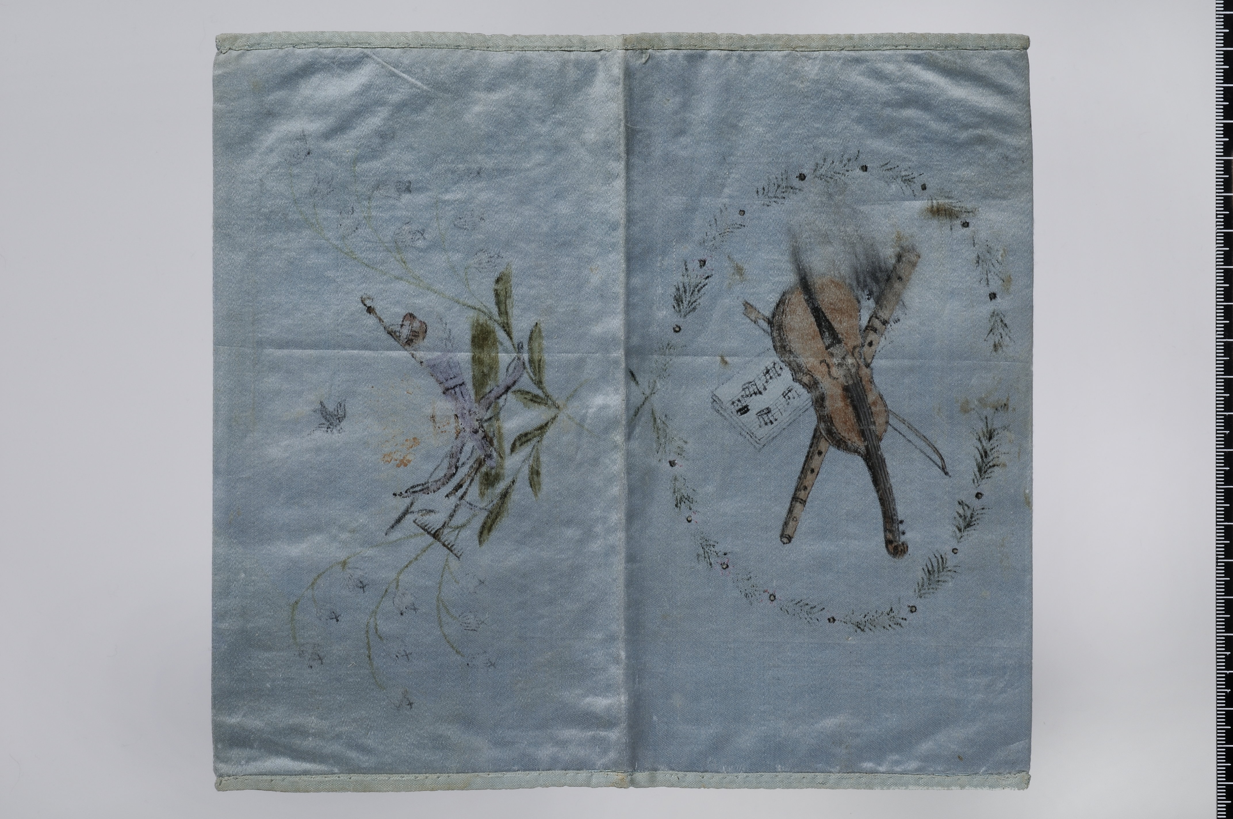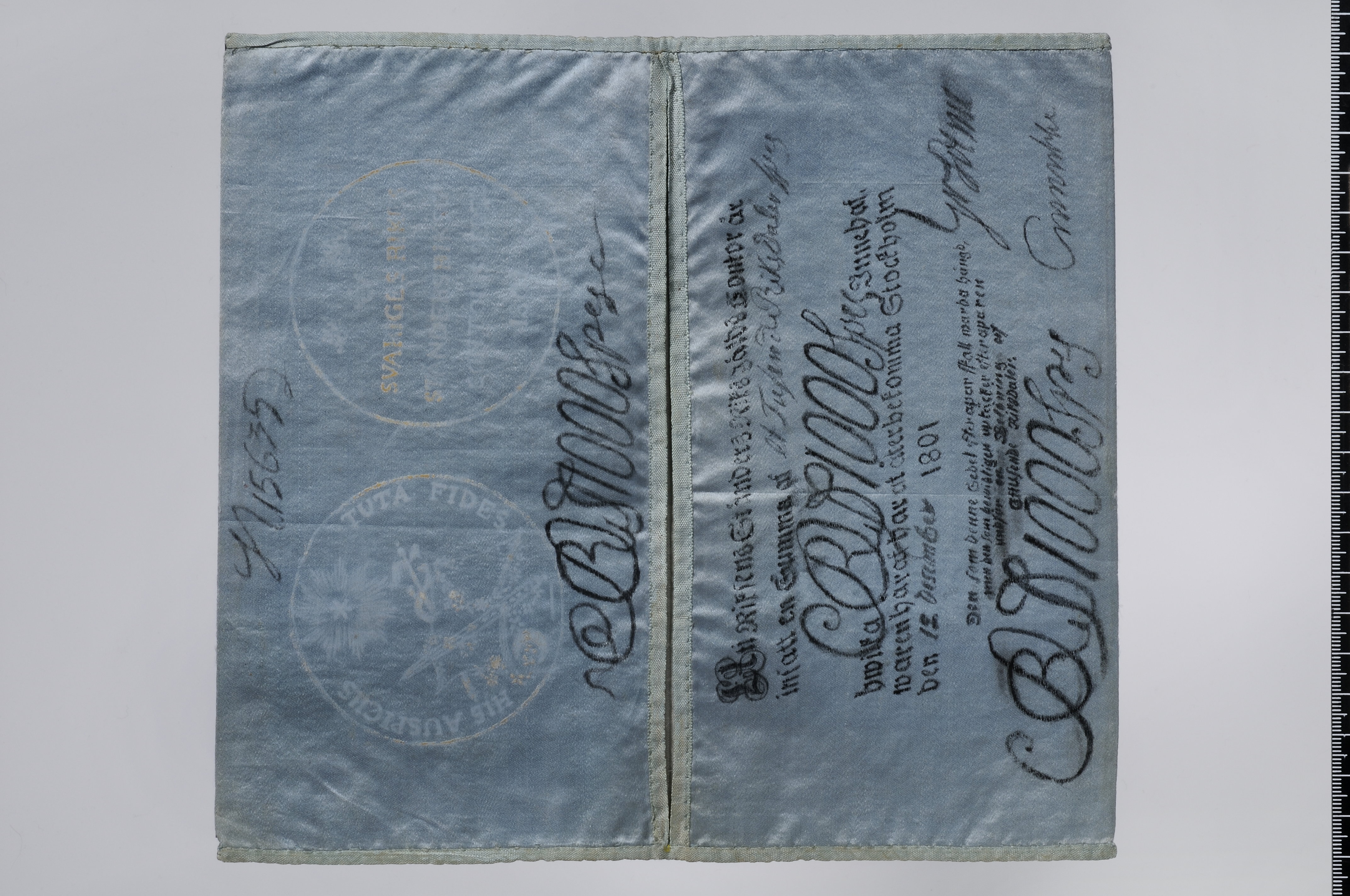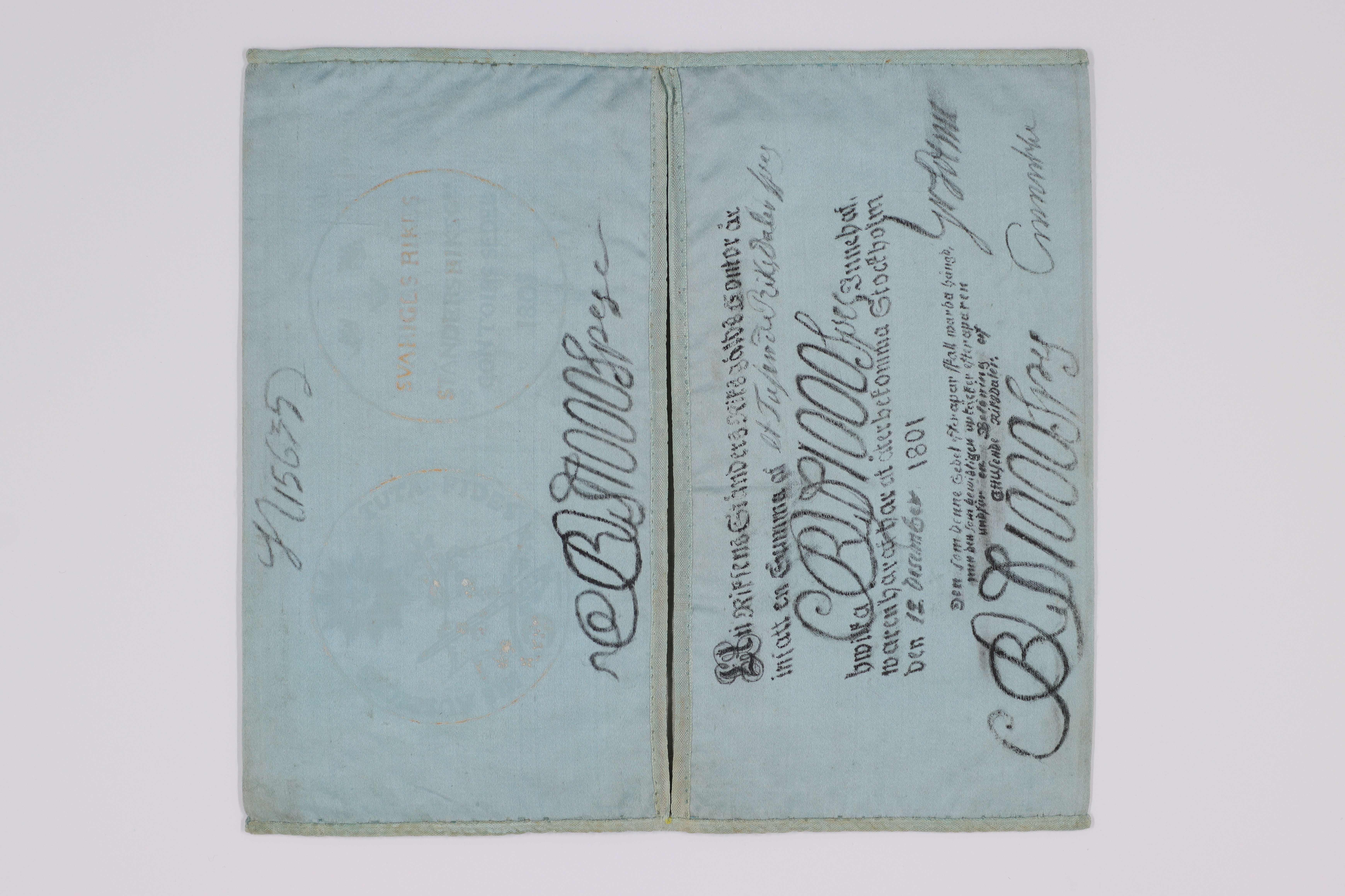 Plånbok av ljusblått siden med målade motiv. Kantad med ljusblått sidenband. Motiv på utsidans ena halva: stråkinstrument och flöjt samt notblad inom en krans av grankvistar. På andra halvan blommor (liljekonvaljer?) runt några skörderedskap. På insidan en sedelavbildning om 1000 Riksdaler Specie. Datumet är 12 december 1801 och sedelnumret är 15635.