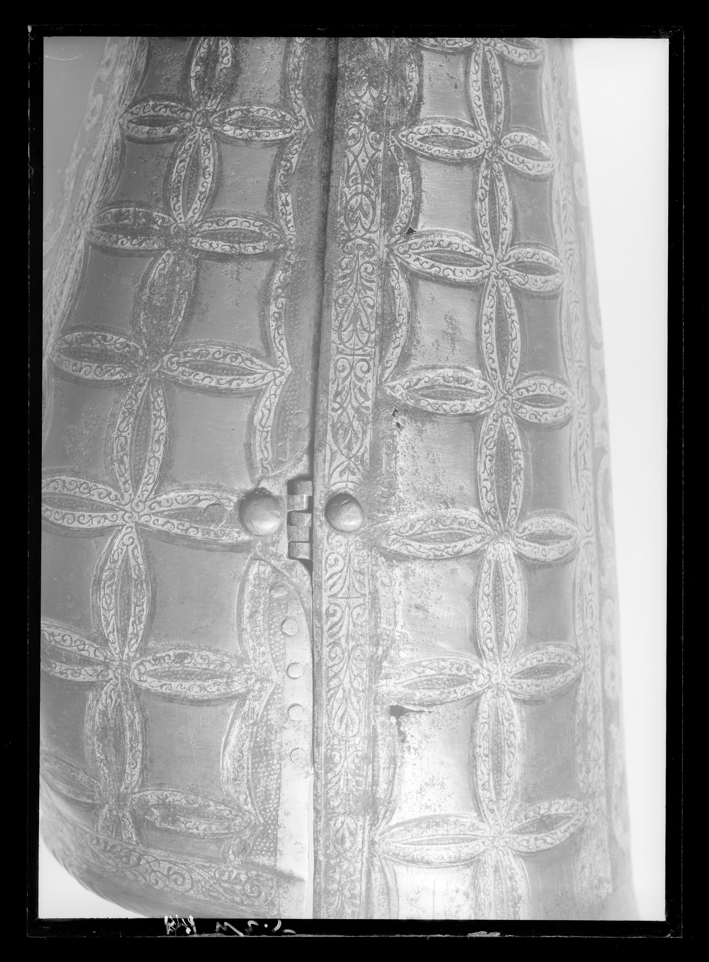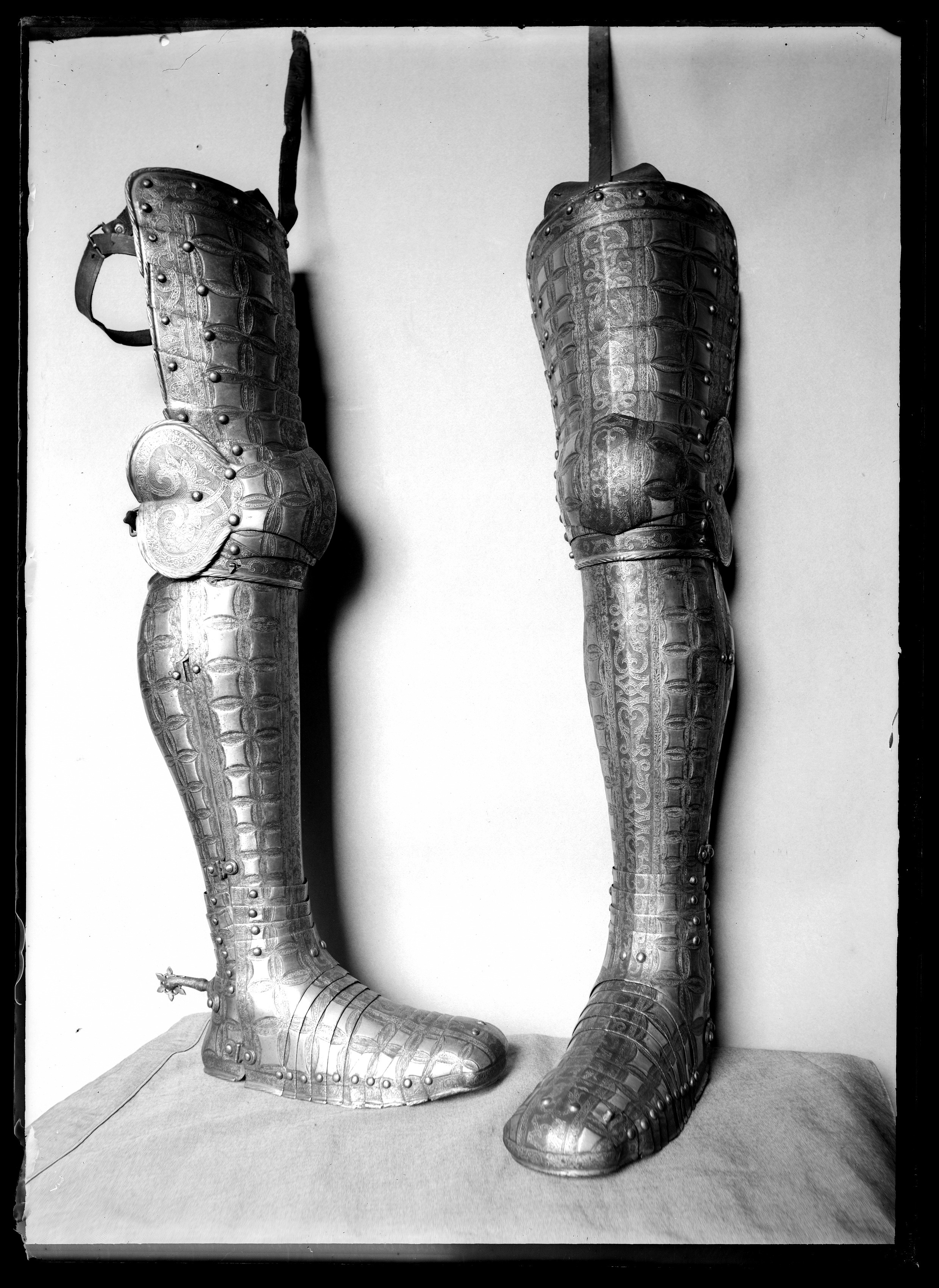 Av stål, etsad och förgylld dekor. Bestående av 22 delar. Vad- och skenben täcks av varsin skena, fästade i varandra med två gångjärn på benets utsida, på insidan två tappar och en hake för stängande. Fotbeklädnaden i 20 delar. Tåskyddet omböjt på fotens insida, ca 45 mm. På hälen en sporre med 45 mm lång, svagt nedåtböjd hals och 6-uddigt, stjärnformigt hjul. Dekor: Som hjälmens. Utmed benskenans mitt - fram och bak en mörkanlöpt rand med prickad botten och ett förgyllt bandornamentmönster. I övrigt förgyllda rosetter mot blank botten. Kanterna upptill och nertill invikta, blanka och räfflade.