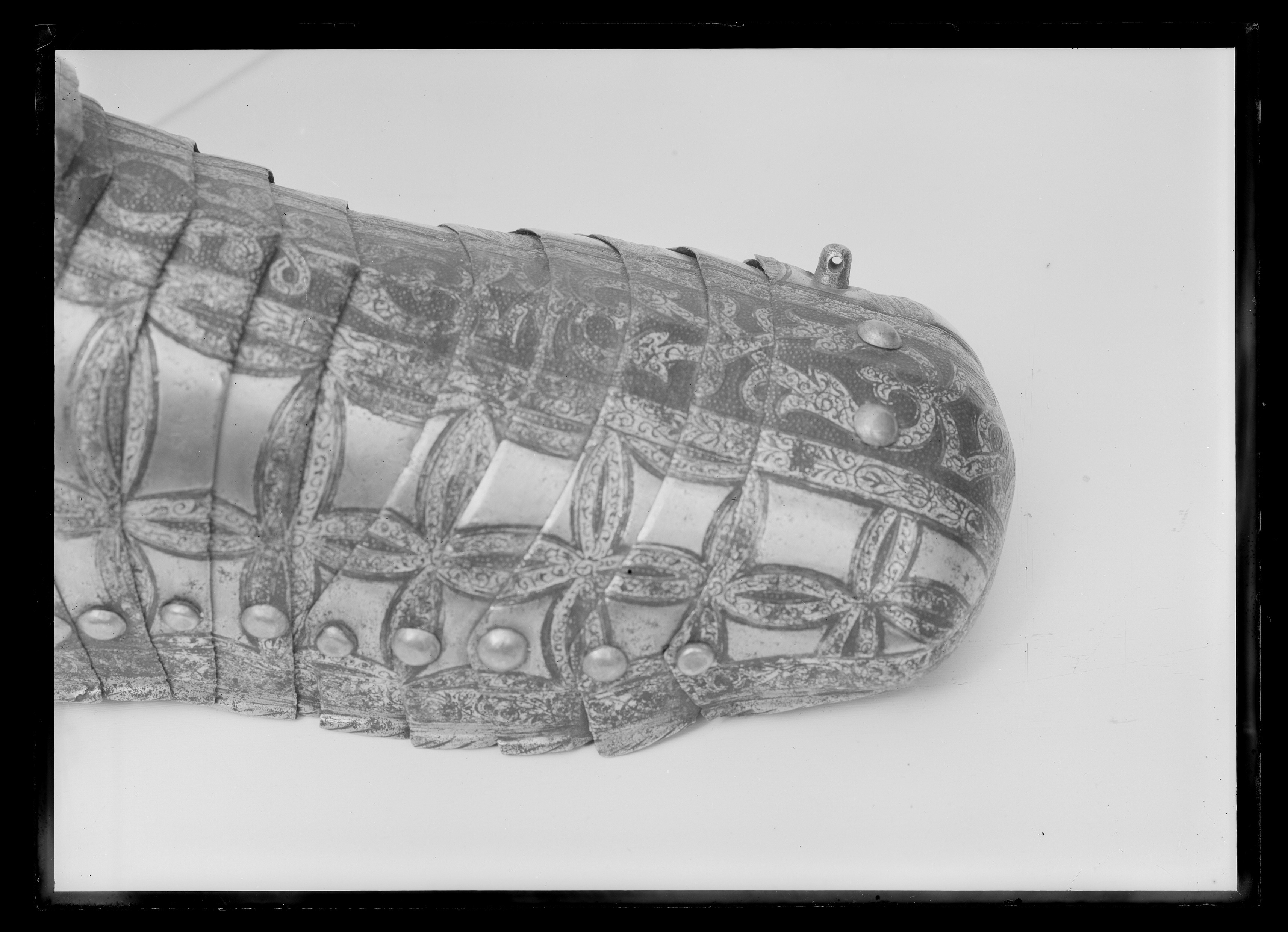 Benpansar, höger benrör och sko, tillverkad i Greenwich ca 1585, etsad och förgylld dekor.