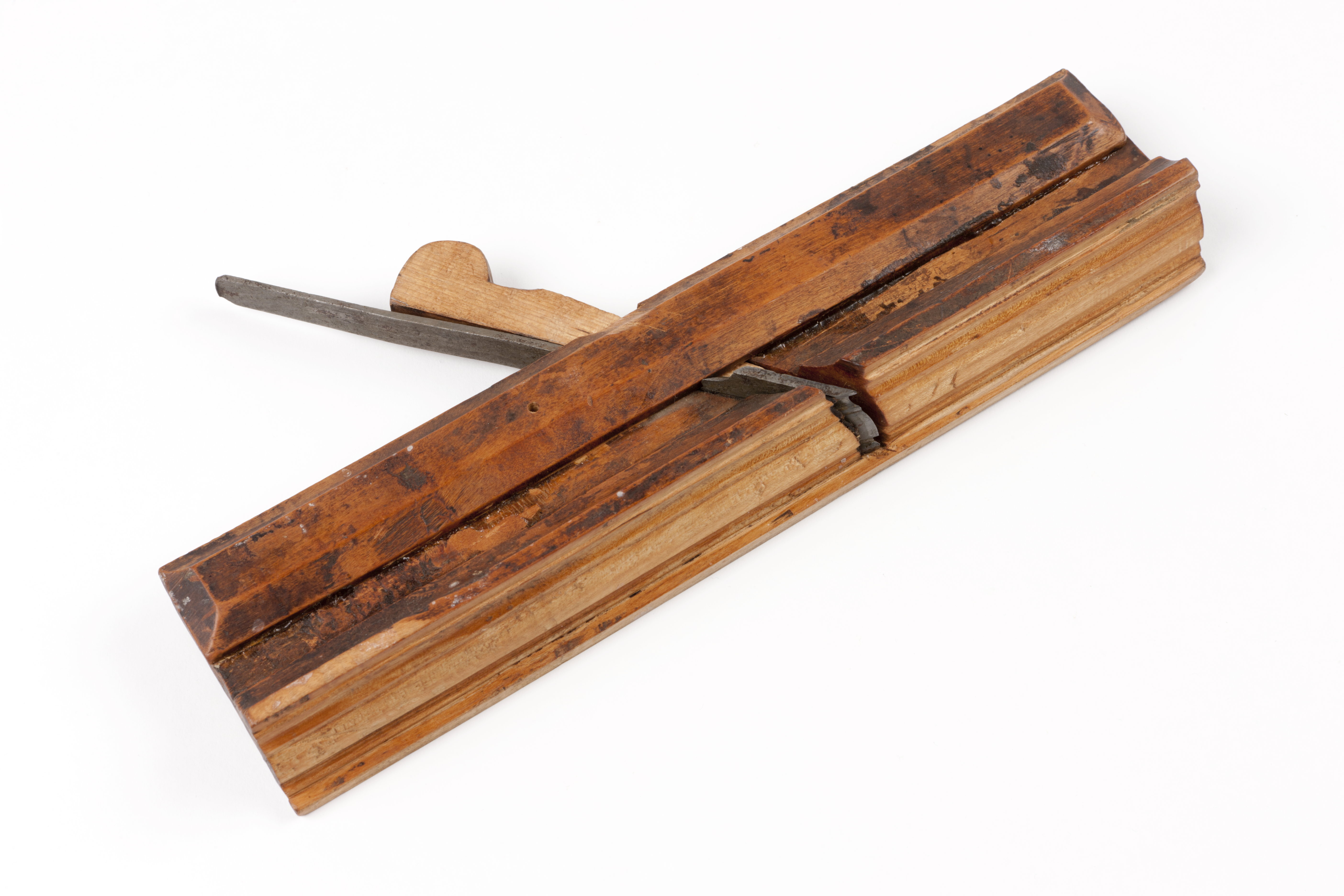 Profilhyvel av lönn. Sammansatt profil, eggens bredd 26 mm. På ena kortsidan stämplat: "27", på höger sida skrivet med svart: "O" (bokstav eller siffra). Järnet stämplat med krona, Stockholm (?). På stockens översida ristat snedkors.