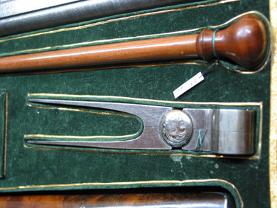 Läskstång av ljusbrunt trä med svarvad knopp, h: 38 mm, d. 29,5 mm. Nederänden skodd med invändigt gängat rör av vitmetall, l 24 mm. Möjligen nr 22 i Oskar I:s samling. Gustaf V:s vapensamling nr 13. Gåva av Gustaf VI Adolf 1957-03-05 gm K. Husterådskammaren. Katalogisering Inga von Corswant 1970-06-24, utskrift NDt 1997-08-12.