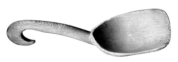 MJÖLSKOPA Av asp. Blad avlångt skåligt, med raka sidokanter, tvär ytterände och bågformig innerände. Skaft kort, snett uppsvängt, flackstavigt och kantställt, ytteränden avslutad i en nedsvängd krumformig hake. Längd: 13,8 cm. Blad, bredd: 4,5 cm.