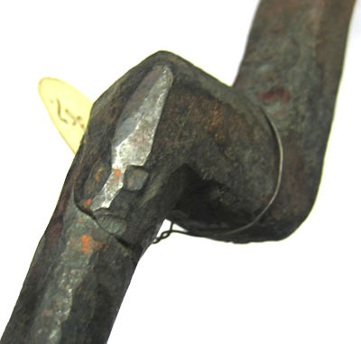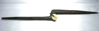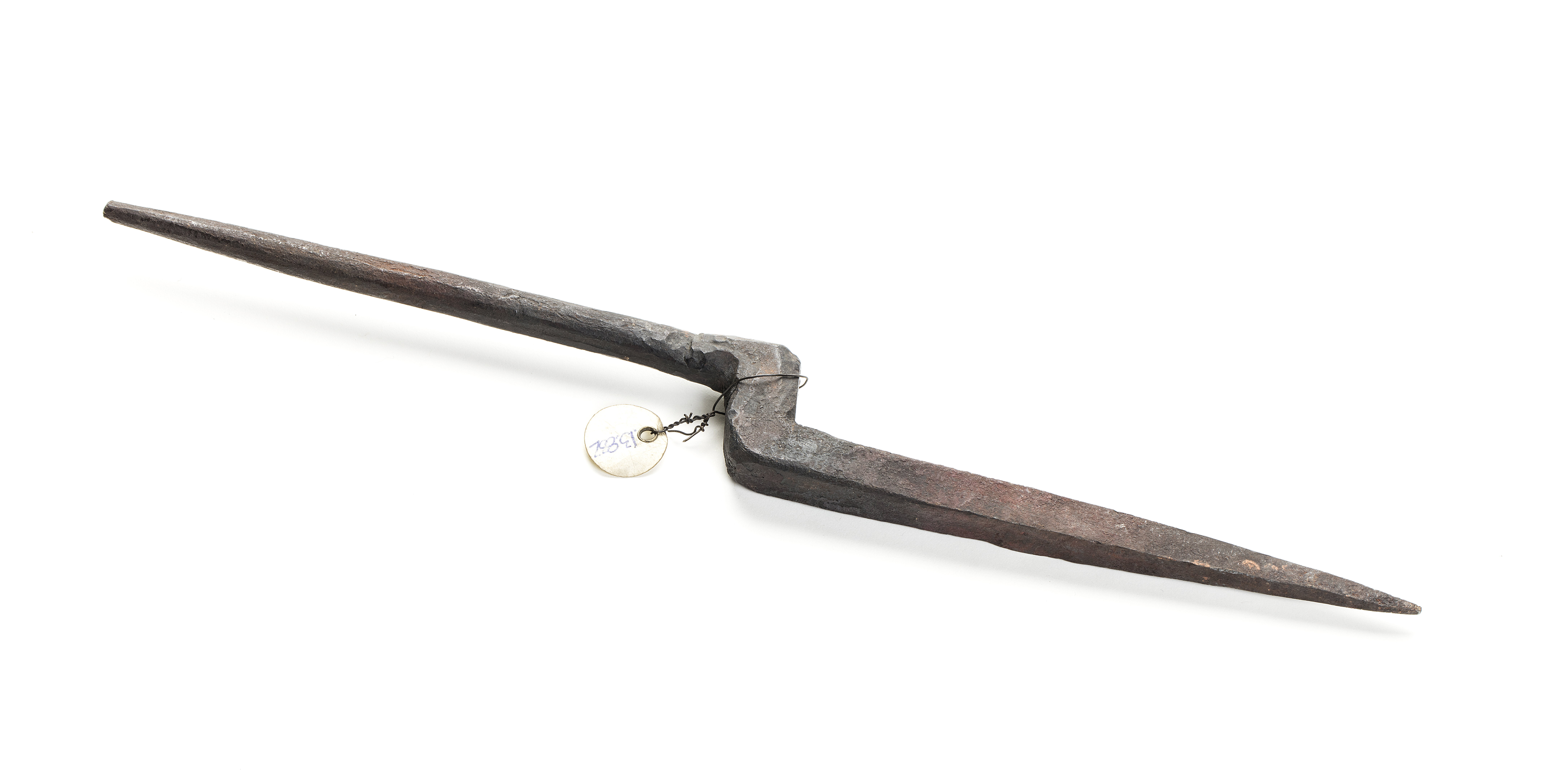 Av två stycken sammansmidda i mitten. Mörkt stål med rödaktiga partier. Ena änden fyrsidig, utåt avsmalnande och spetsig, andra änden med närmast cirkulärt tvärsnitt.