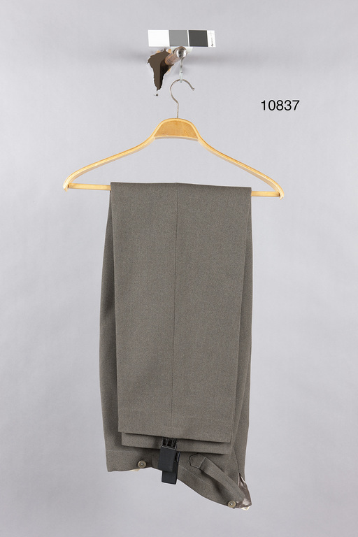 Långbyxor av grå diagonal. Gylf med nio, grå knappar, d: 14 mm, med firmanamn: "MILITÄREKIPERINGS A.B.". Linning med sex lika knappar, d: 17 mm. I sömmen mitt bak infälld kil av grått siden. Två bakfickor knäppta med vardera en knapp. Däremellanspänntampar med blånerad sölja med text: "SOLIDE". Fickor i sidsömmen. Hällor nedtill av 30 mm brett resårband fäst på byxbenens insidor med dubbla knappar, hällan vid fästet försedd med svart lackskinn.
