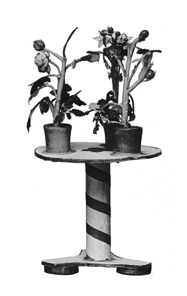 BORD (blomster-) Av papp. Runt, med stolpfot med platta på tre fötter. Ljust gråmålat med vattenfärg. Skivan med rak kant i rött, på översidan i mitten en pålagd femuddig rosett i grönt med tvärgående ränder i guld. Stolpe cylindrisk, med en i spiral gående röd rand. Platta trekantig, med insvängda kanter i rött; under varje hörn som fot en rund skiva med förgylld kant; på plattans undersida en rosett som på skivan. På bordet tre blomkrukor av trä, i varje en växt med stjälk och blad i grönt samt blommor i färger, bland andra en röd ros. Bord, höjd: 4 cm. Skiva, diameter: 4,2 cm. Från 1800-talets mitt. Gåva till Wilhelmina (Mina) Kempe under 1850-talets förra hälft.