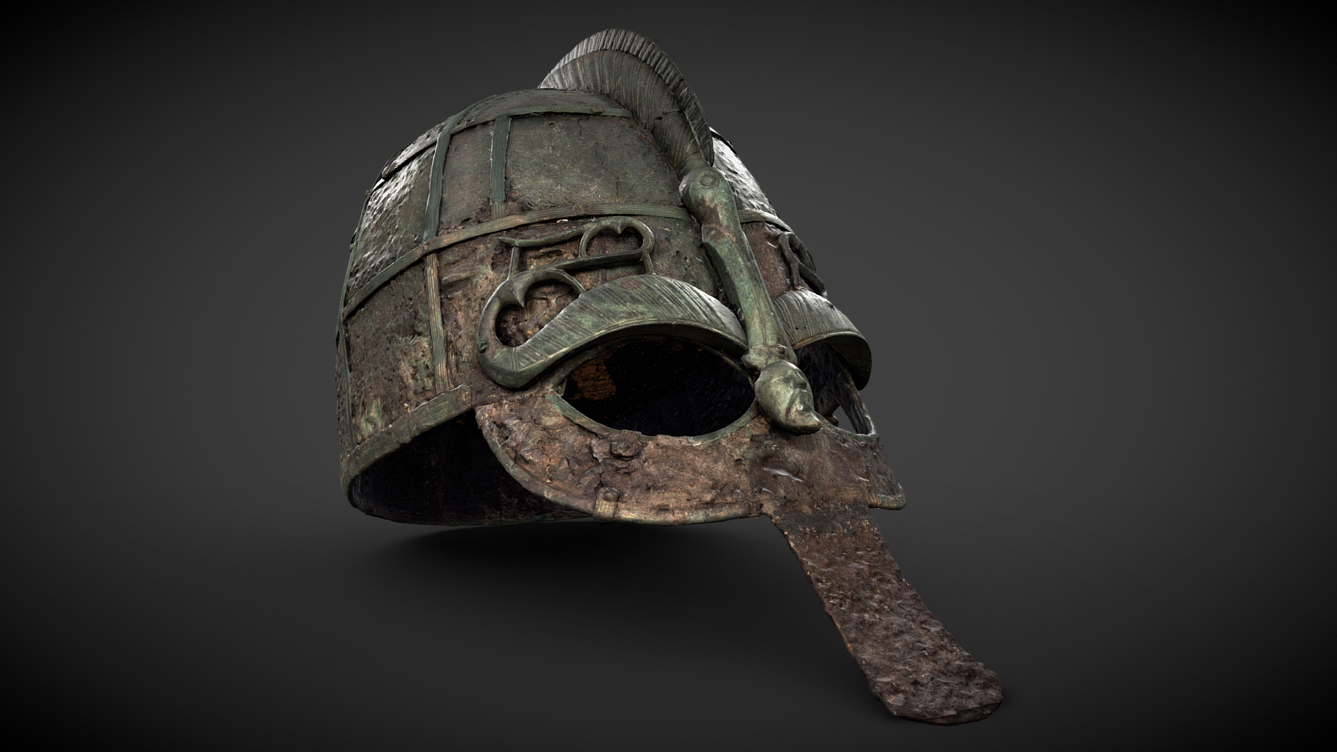 Prakthjälm av järn med pålagd dekor av brons, bl a rester av pressbleck med figurscener