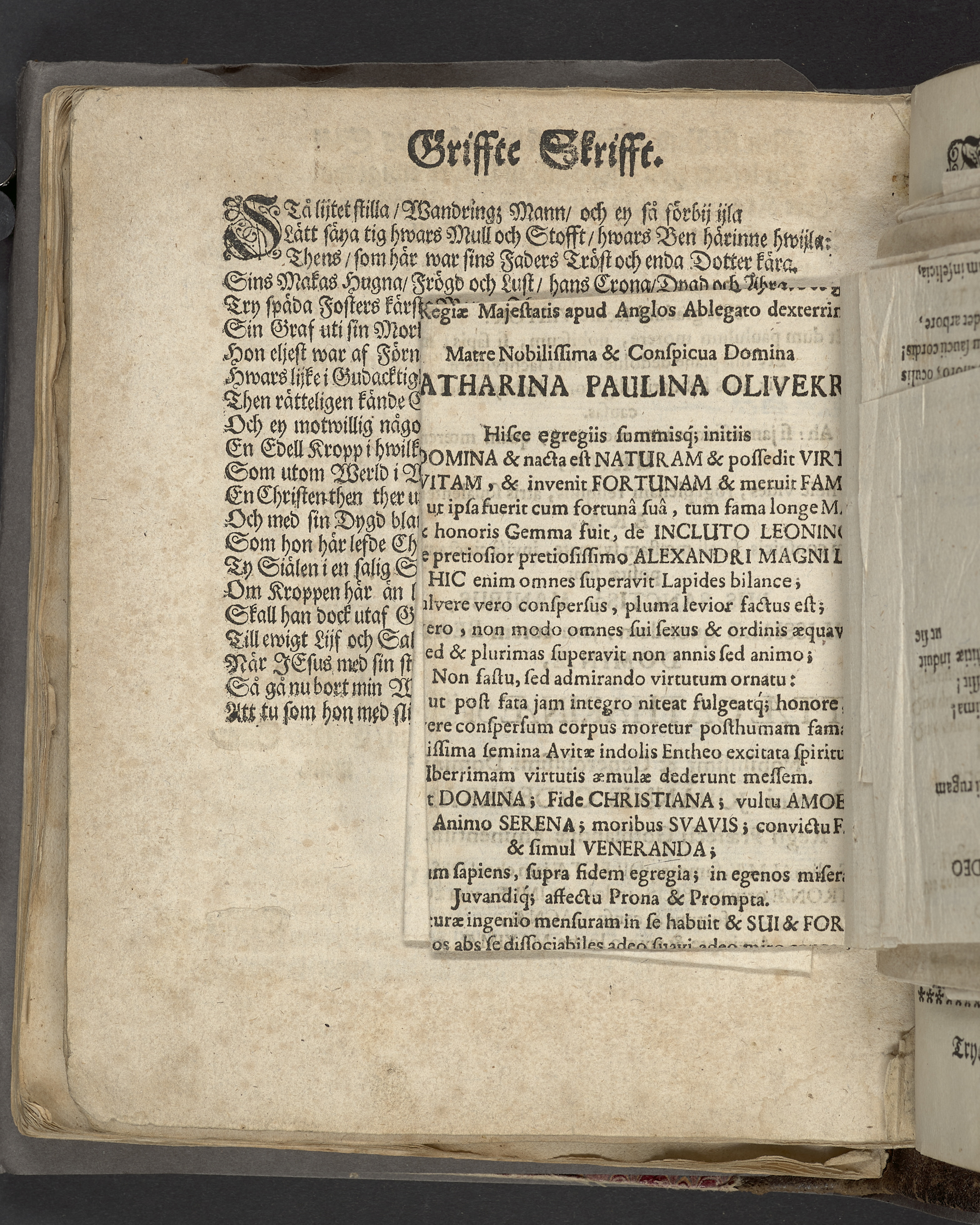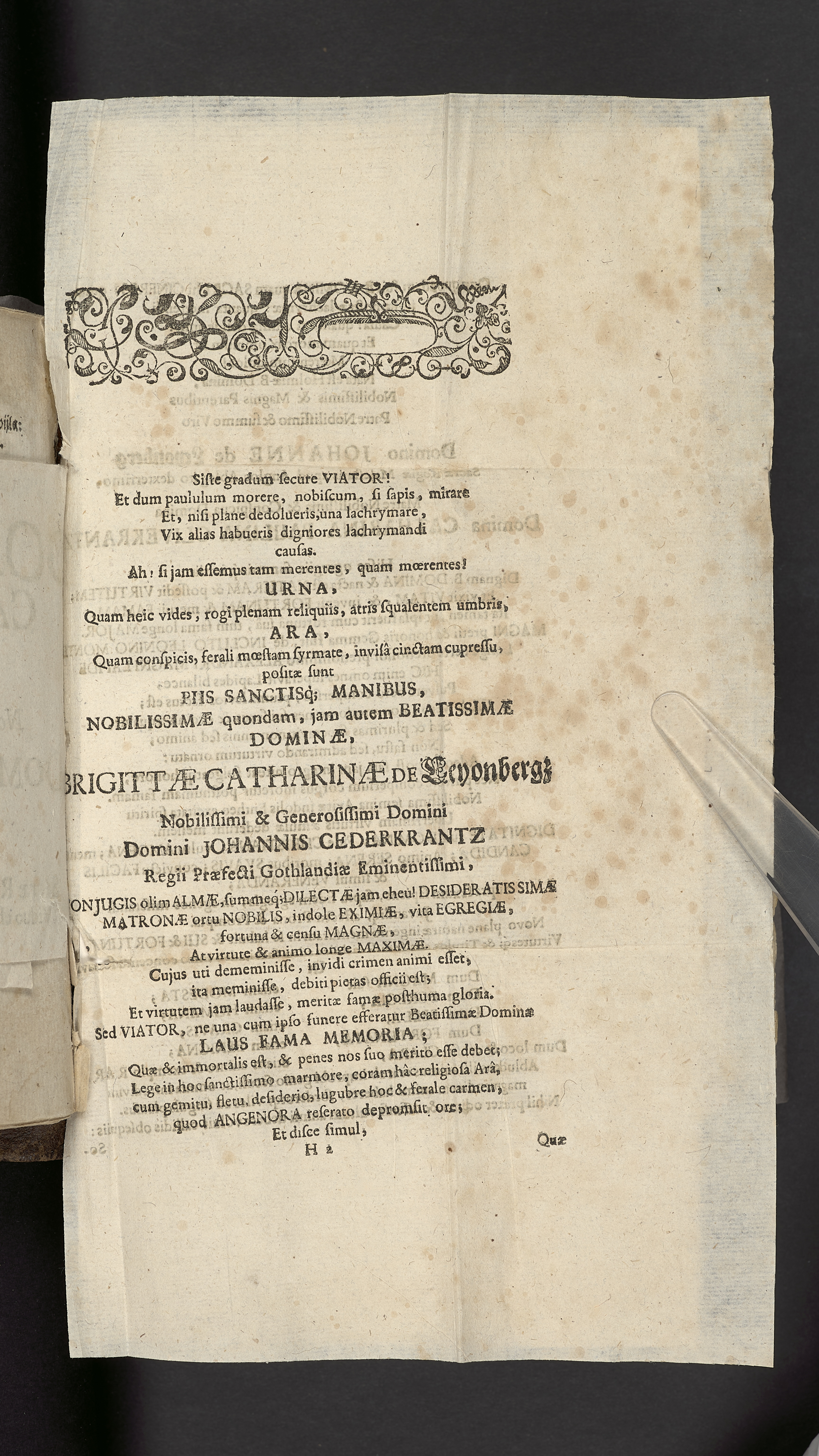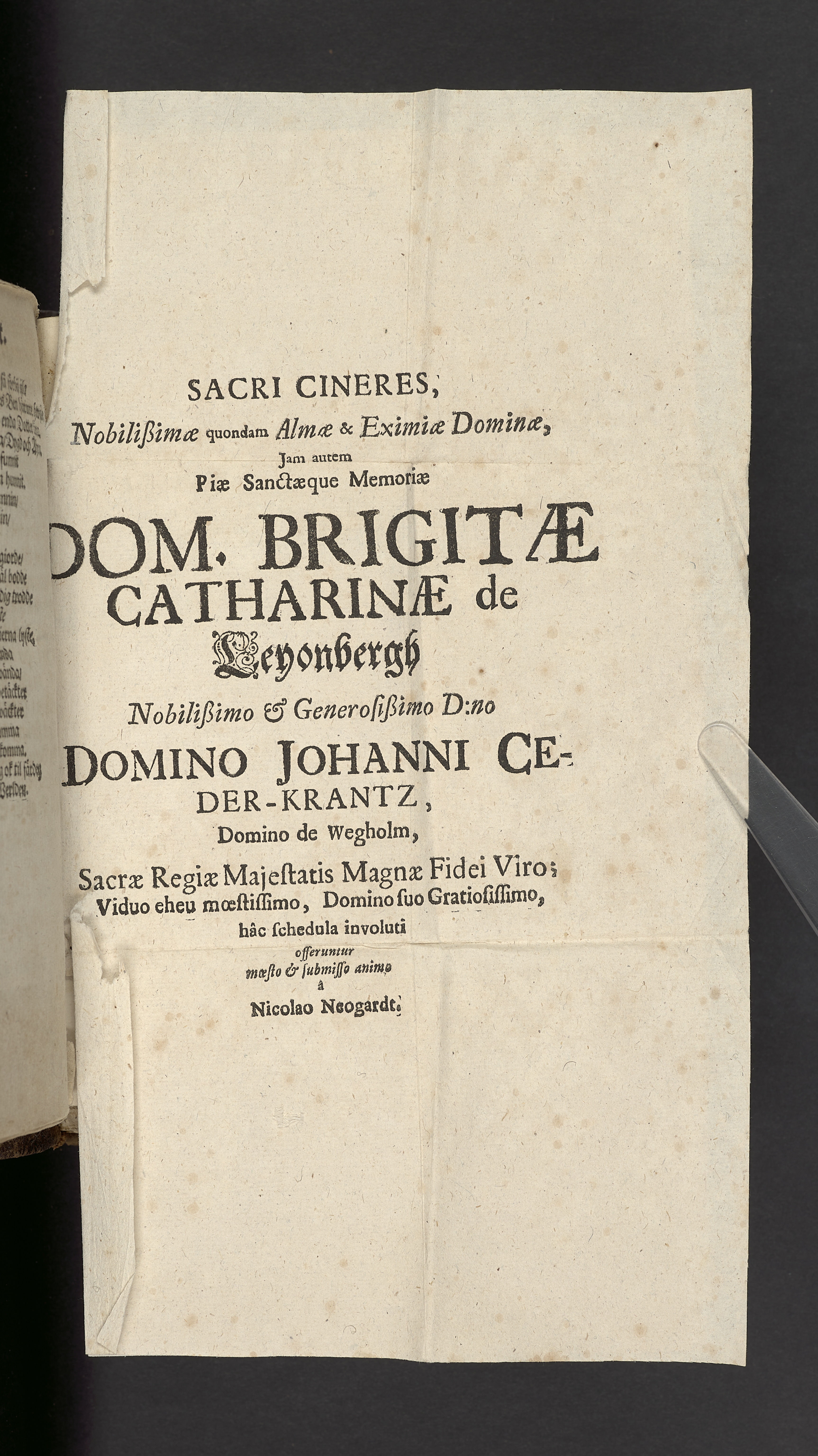 Sacri cineres ... memoriæ dom. Brigitæ Catharinæ de Leyonbergh ... domino Johanni Ceder-Krantz, domino de Wegholm ... offerunteer ... a Nicolao Neogardt.