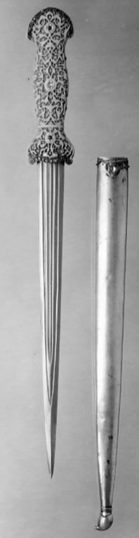Topkapi-verkstäderna, Istanbul ca 1700-tal. Balja av slätt silver med spår av förgyllning. Ovalt tvärsnitt. Munbleck med konturerad kant, på utsidan en rubin, på insidan en smaragd. Upptill på utsidan en liten bygel (fäste för bäranordning) med ornerad över- och nederdel. Doppsko päronliknande med liten bakåstvängd, droppformig nederdel.