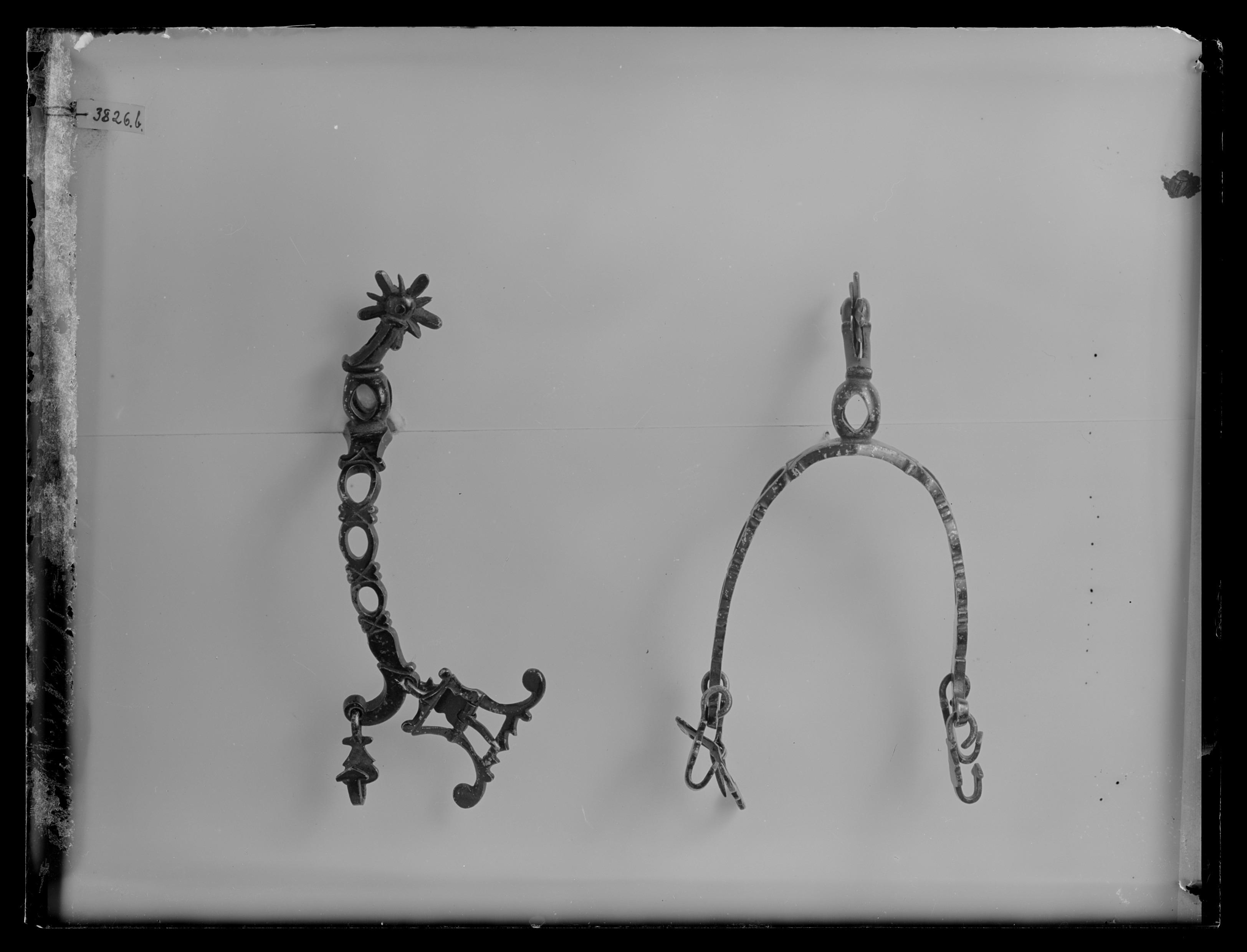 Sporre av mässing, målad med blå emaljfärg på silvergrund. U-formade, svagt böjda skänklar, genombrutna och ciselerade, ändarna nedböjda med två hål vari på ena sidan två hakar, på andra i det undre en hake i det övre ett spänne med utstående voluter i sidorna 30 mm långt50 mm brett. Hals, 42 mm lång, böjd uppåt i vinkel. Halsfoten oval, genombruten. Klingan, 25 mm i diameter med fem uddar och fem mindre uddar emellan dessa.