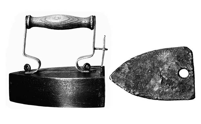 STRYKJÄRN med löst lod. Av järn, gjutet. Ihåligt, platt, hjärtformigt samt med handtag. Baktill en skjutbar lucka. Spolformigt handtag av ask mellan två uppstående platta skenor. Höjd: 16,7 cm. Längd: 18,6 cm, bredd: 12,6 cm, tjocklek: 5,7 cm. Lod: Av järn, tjockt, platt, i form som stykjärnet, i bakre ändan ett runt hål. Längd:16,6 cm, bredd: 10,3 cm, tjocklek: 2,7 cm. Överförd av Wilhelmina von Hallwyl 1916 från säteriet Ericslund, Södermanland, till Hallwylska huset, Stockholm.