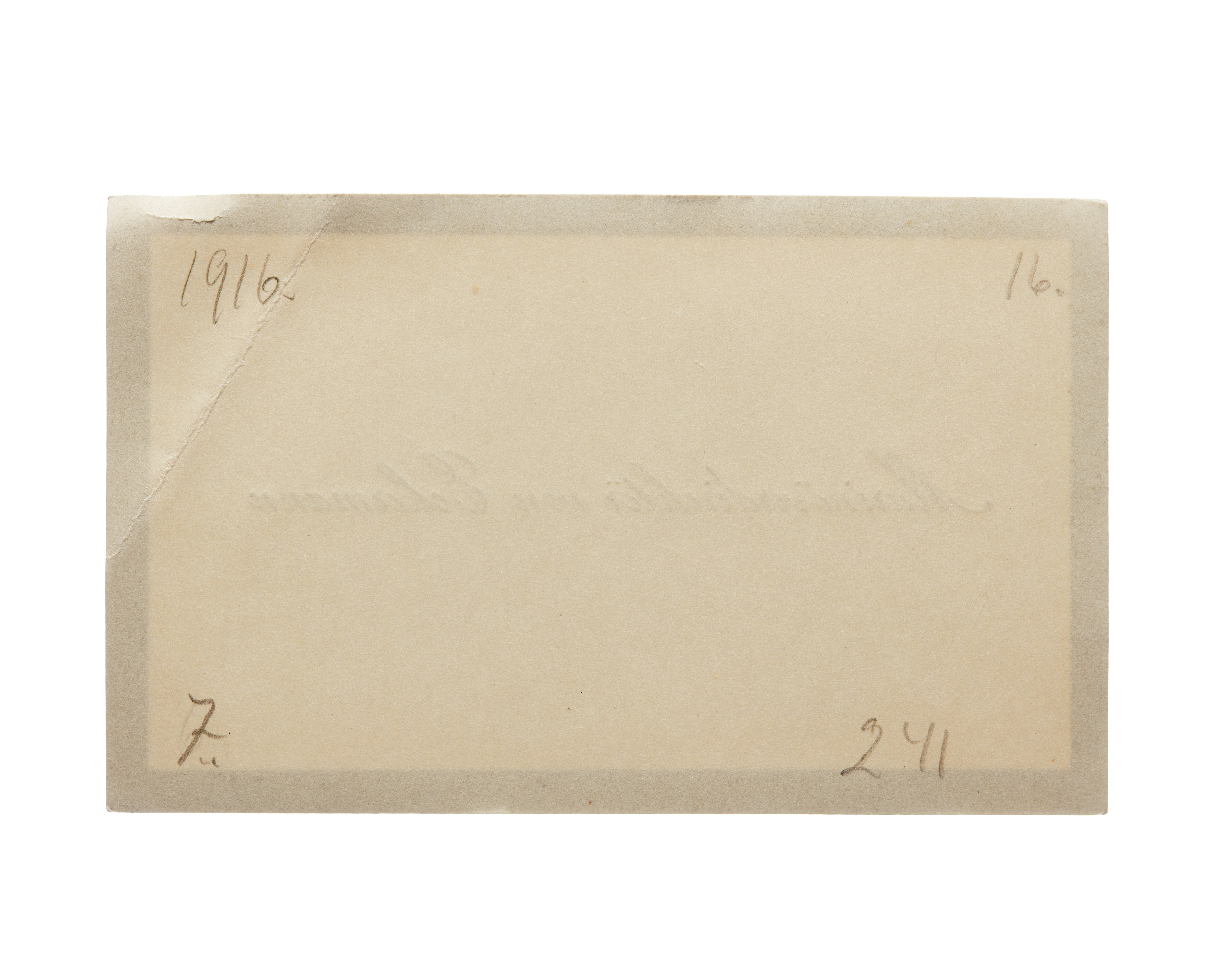 Sexton kort från Agust von Eckermann, marinöverdirektör och chef för mariningenjörkåren. Första kortet är utan datum, vikt i övre högra hörnet, adress (nedre högra hörnet) Lilla Bältgatan 12. Andra kortet daterat 1914, vikt i övre högra hörnet. Tredje kortet daterat 1915, vikt i övre högra hörnet. Överlämnat i samband med Vilhelminas bilolycka i 1915. Fjärde kortet daterat 1915, vikt i övre högra hörnet. Överlämnat i samband med Vilhelminas bilolycka i 1915. Femte kortet daterat 10.06.1915. Överlämnat i samband med guldbröllop, 1915. Sjätte kortet daterat 1916, vikt i övre högra hörnet. Sjunde kortet daterat 1916 samt sorgkant, vikt i övre högra hörnet. Åttonde kortet daterat 1916, vikt i övre högra hörnet. Nionde kortet daterat 1916, vikt i övre vänstra hörnet.Tionde kortet daterat 1916, vikt i övre vänstra hörnet. Elfte kortet daterat 1917, vikt i övre högra hörnet. Tolfte kortet daterat 1917, vikt i övre högra hörnet. Trettonde kortet daterat 1917, vikt i övre vänstra hörnet. Fjortonde kortet daterat 1917, vikt i övre vänstra hörnet. Femtonde kortet daterat 1919, vikt i övre vänstra hörnet. Sextonde kortet daterat 1919, vikt i övre vänstra hörnet.