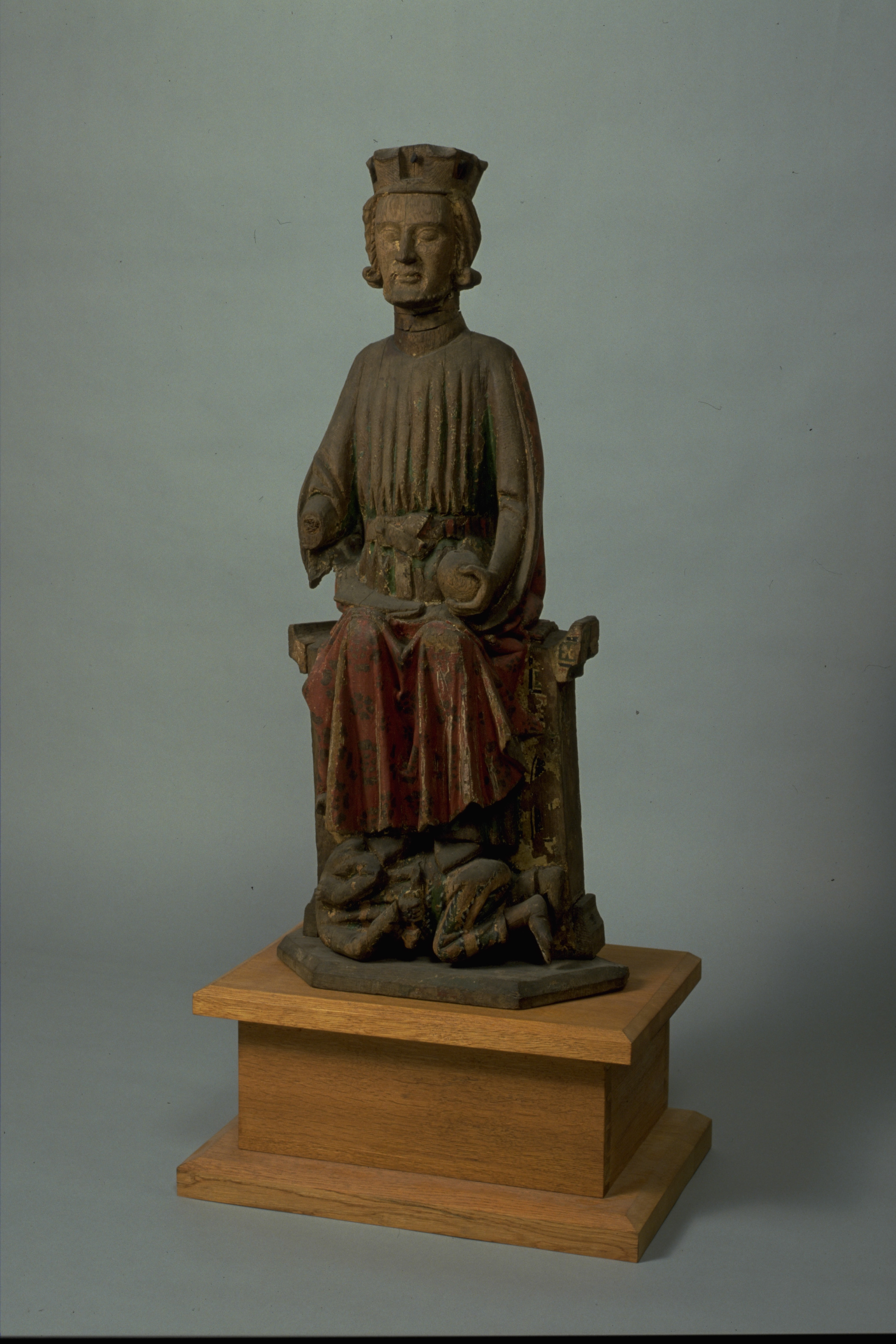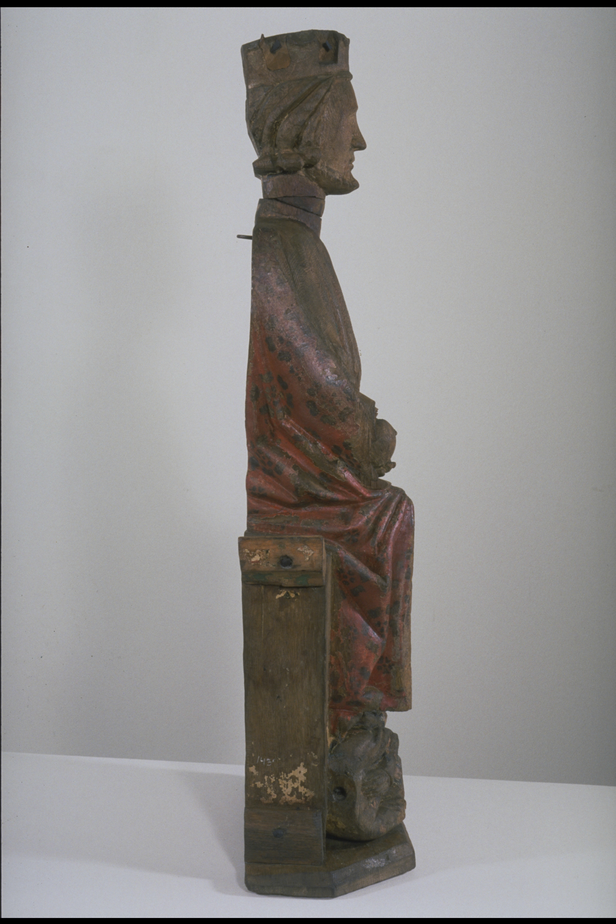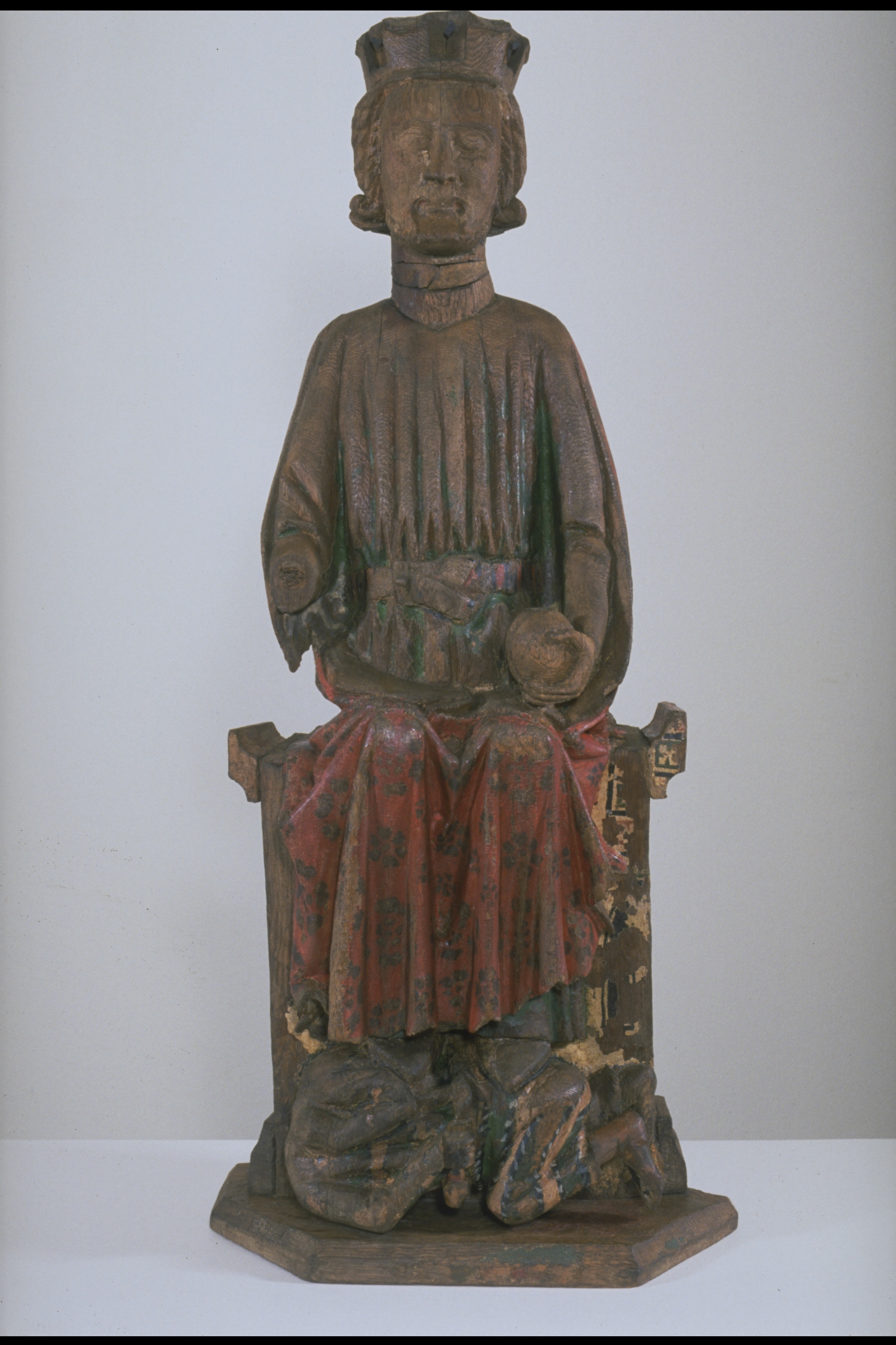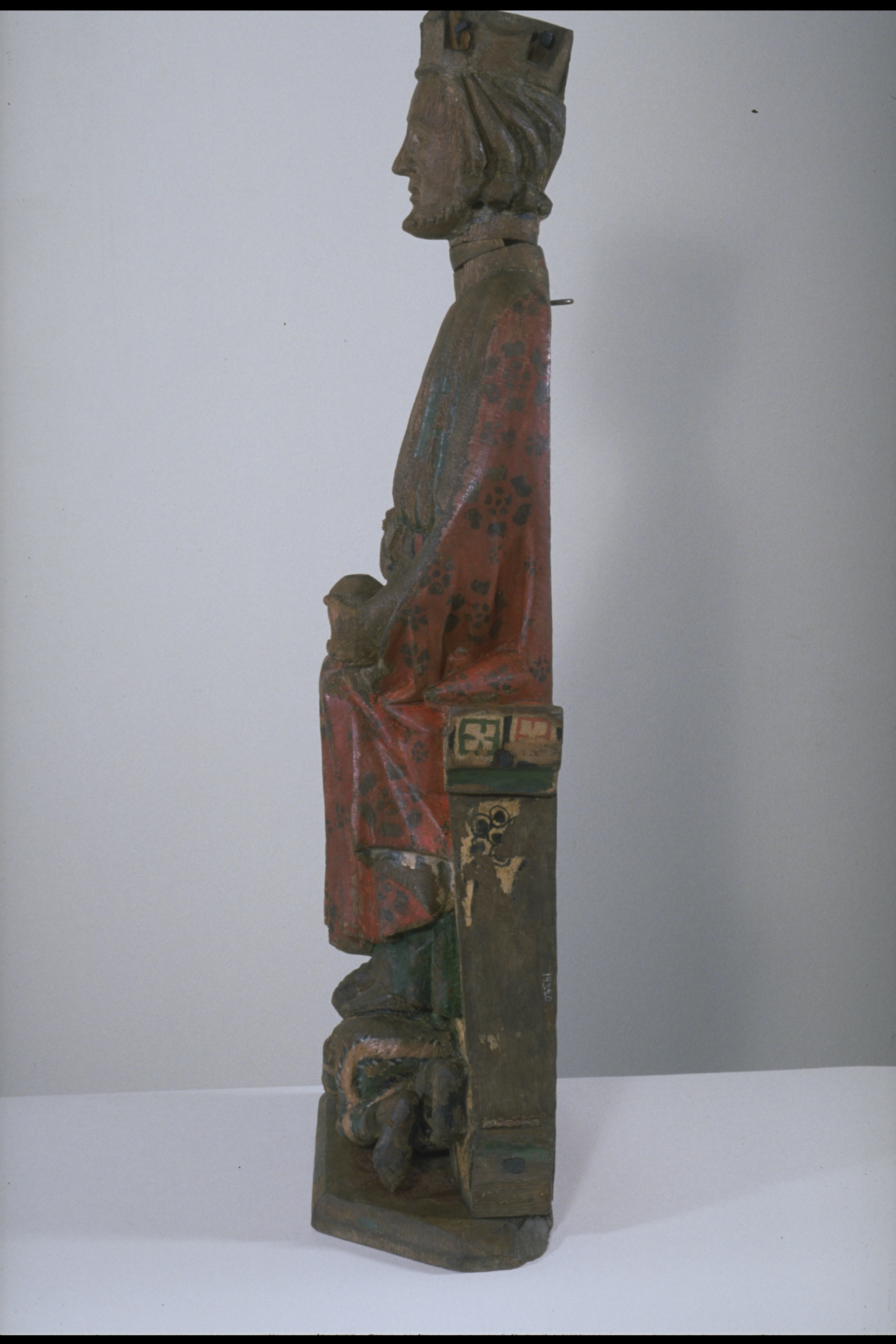 ek med kompletteringar i annat lövträ. Kondition: höger hand med attribut, en yxa (?), förlorad, underliggarens ansikte bortfläkt. Färg: betydande fragment bevarade.