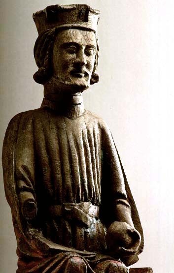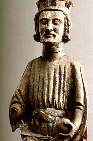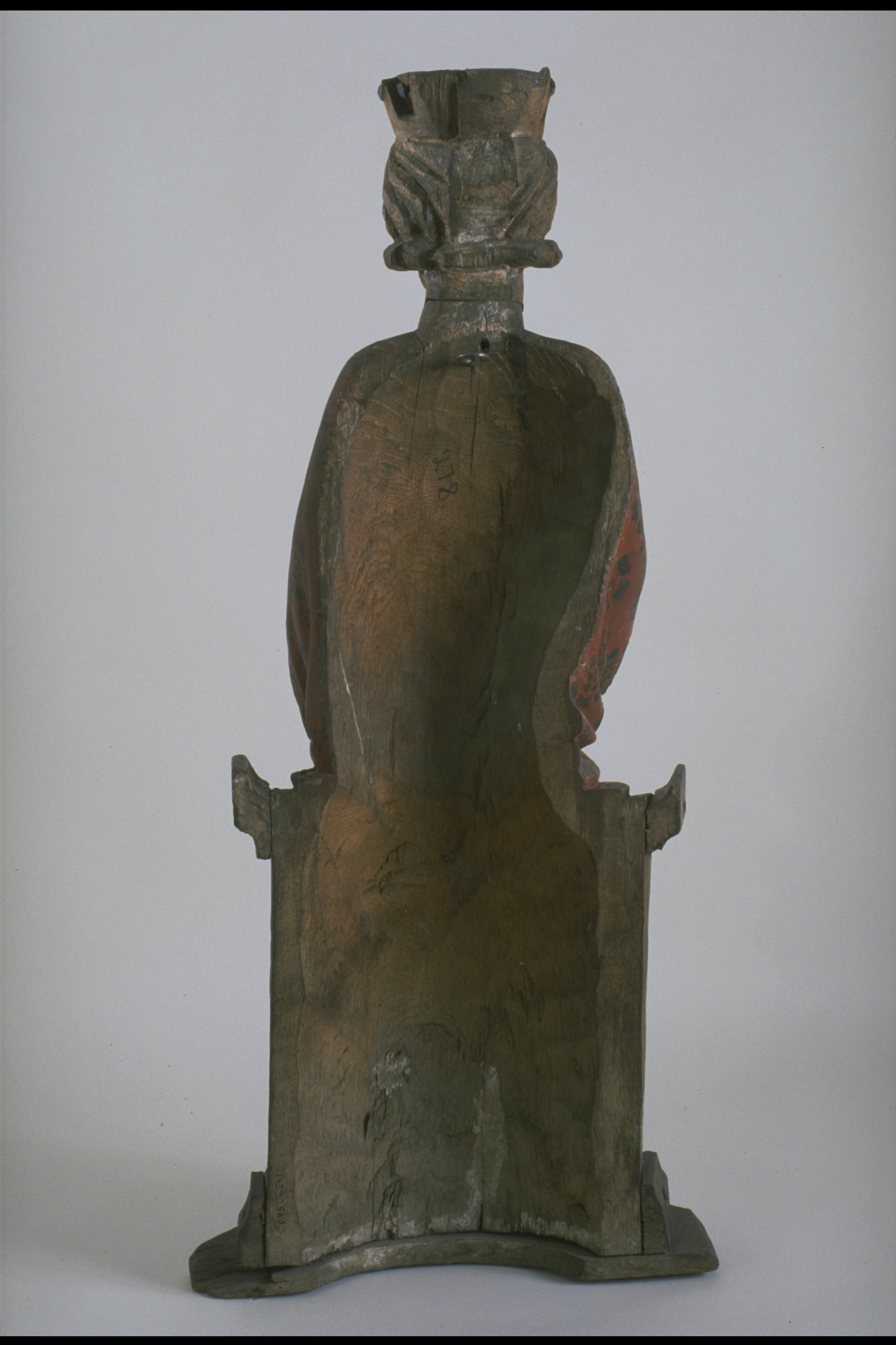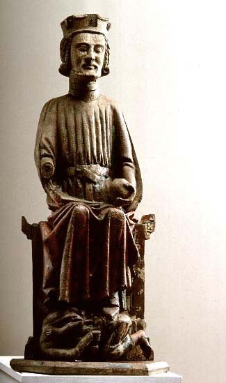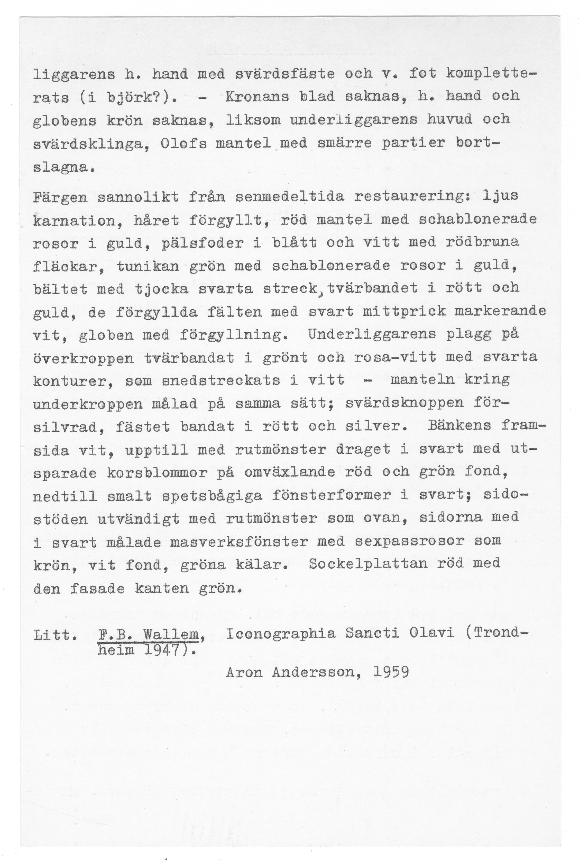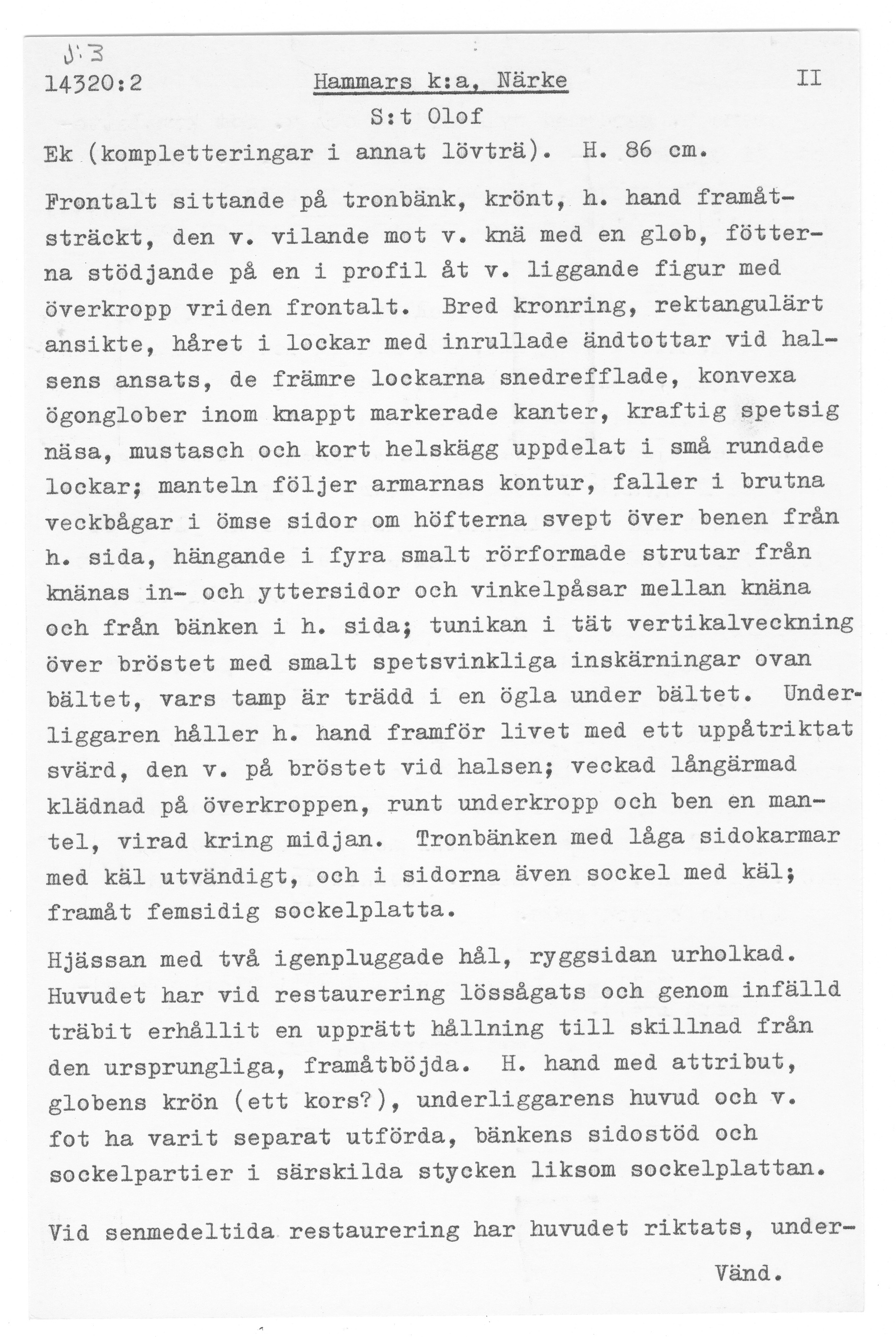 ek med kompletteringar i annat lövträ. Kondition: höger hand med attribut, en yxa (?), förlorad, underliggarens ansikte bortfläkt. Färg: betydande fragment bevarade.