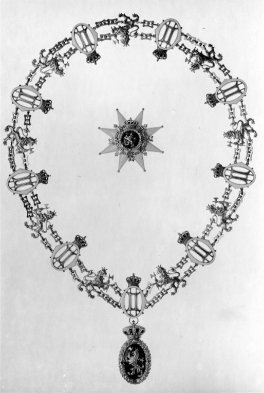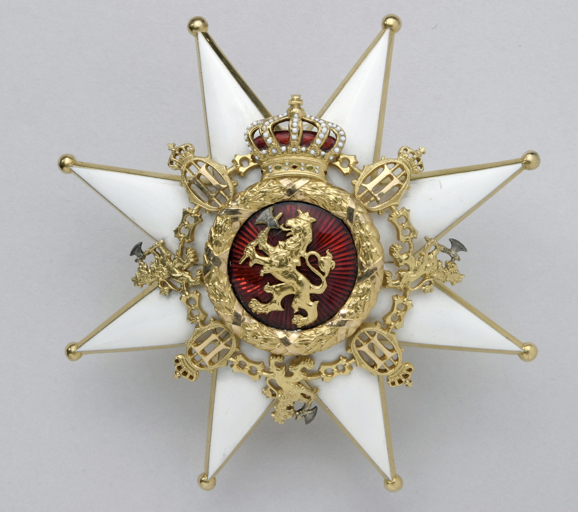 Åttauddigt, djupt kluvet, vitemaljerat grekiskt kors av guld, kulor på spetsarna. Rund, välvd medaljong täckt av röd, genomsynlig emalj, därpå ett krönt lejon av guld, i framtassarna en yxa med blad av silver och rakt skaft av guld. Däromkring en lagerkrans av guld, omlindad med korsande band på åtta ställen, kransen krönt av en kunglig krona av guld samt vit, röd och grön emalj, rödemaljerat foder. Runt kransen en kedja sammansatt av 15 länkar, fyra krönta namnchiffer OII, tre krönta guldlejon med silveryxor i framtassarna och åtta rektangulära länkar. Frånsidan av guld, täckt med fiskfjällsdekor, i mitten en åttabladig blomma omgivande rund ring med firmamärke: "J.TOSTRUP.KRISTIANIA" och rund mutter för medaljongen. Säkerhetsnål.
