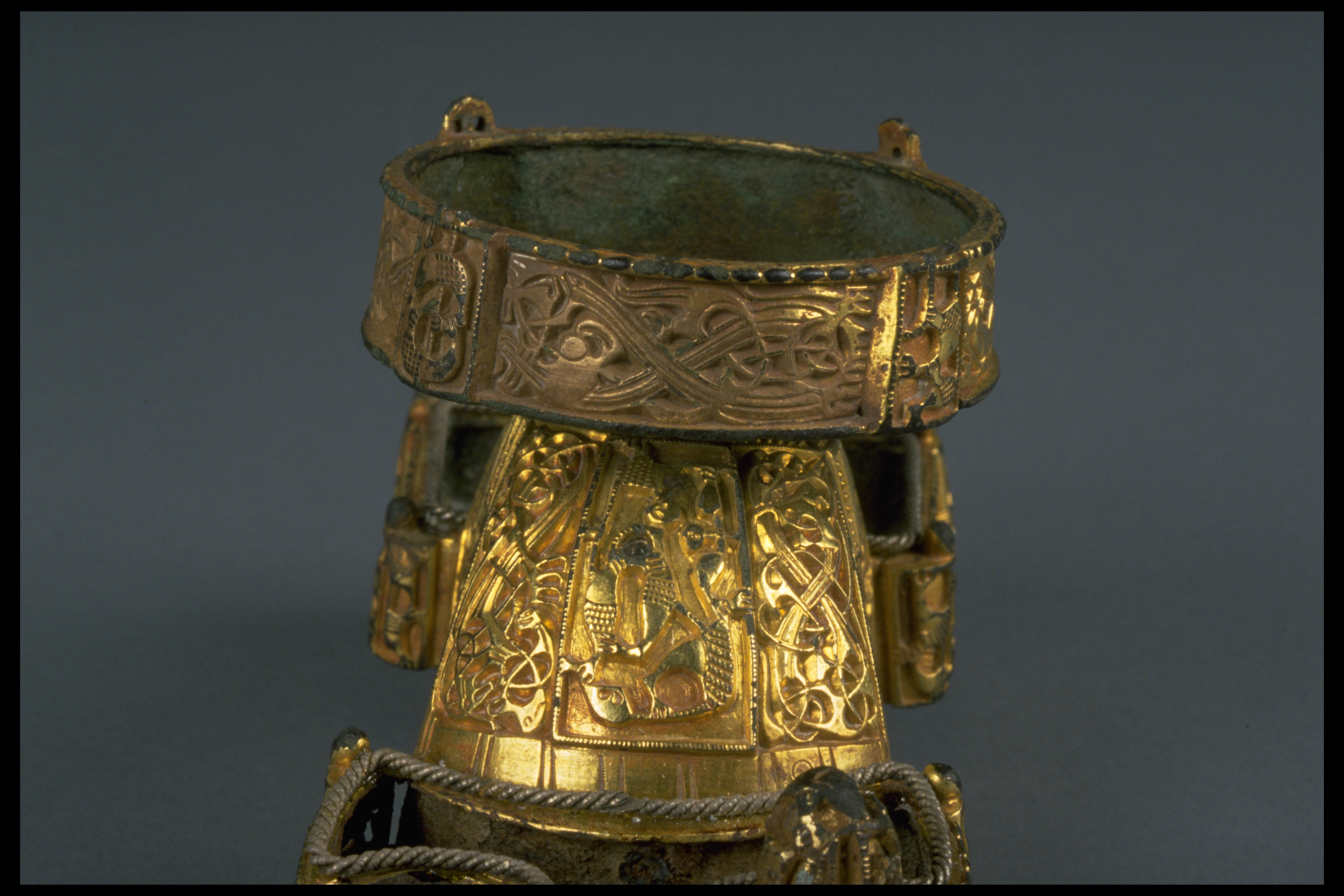 "1 st. runt bronssmycke; dosformigt; utan lock eller överskålla; med prydliga, starkt förgyllda slingsirater på sidorna; bottnens undersida polerad, med strecksirater och fyra ovala förgyllda slingsirater; i mitten ett rund hål, kring vilket synes spår av järnrost (hör till spännet Inv. nr. [SHM] 1078)." Dekor i sen vendelstil/tidig stil III