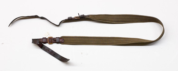 Bärrem vävd av ylle i brunt och brungult, ripsliknande mönster, i båda ändar fästremmar av läder, l: 345 mm med spännen av orange-målat stål, fem spännhål.