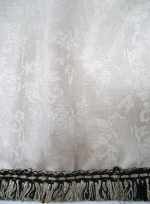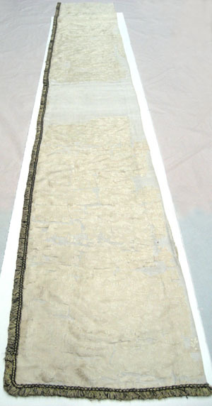 En våd, mycket fragmentarisk, av isabellafärgad sidendamast. Våden är sammanfogad av flera stycken och har två tvärgående sömmar samt tre kilar. En långsida och en kortsida, nedre fållen, kantad av en franskant av svart och isabellafärgad silke, bredd: 18 mm. Samhör med liknande delar av sängomhängen nnr 19612-19621.
