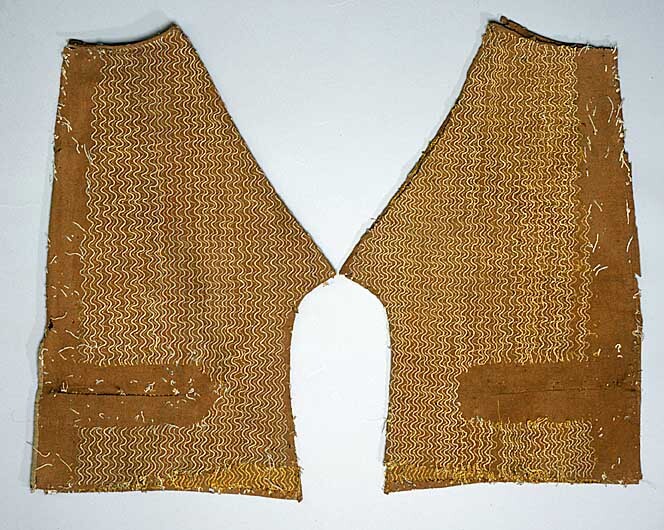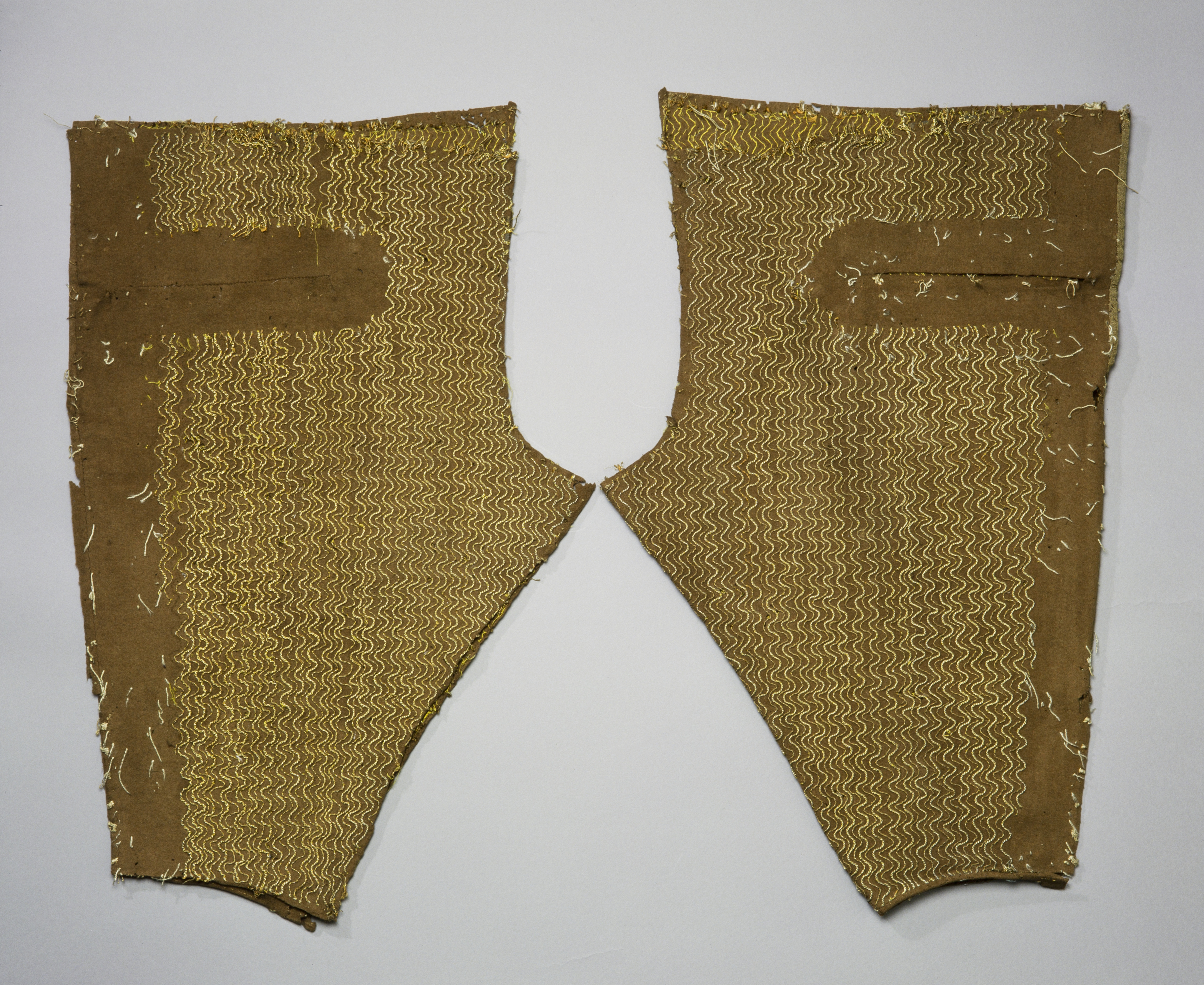 Byxben i melerat brunt och grönt ylle, dekorerad med guldsnoddar i vågmönster. Byxbenets fram- och bakstycke endast sammanhållna av ett litet smalt stycke vid yttre sömmen. Byxbenet dekorerat med 2 st olika guldsnoddar i ett lodrätt vågmönster, ngt osymmetriskt. Guldsnoddens kärna är av orangefärgat silke och snodden är nedsydd med gult silke. Dekoren täcker hela bakstycket utom ett parti på 40 mm vid yttre sidkanten. Även hela framstycket täcks av dekor utom sidpartiet vid yttersidan och 40 mm runt det hopsydda ficksprundet. På framstycket finns 110 mm från midjan ett från baksidan hopkastat sprund (ficksprund?) 170 mm långt. Bakstycket avslutas nedtill med en 200 mm bred skoning som endast är fastsydd med några stygn. Spår av knäsprund, en 10 mm bred stagning av linnelärft i brunt. Även spår av 6 st knappar.