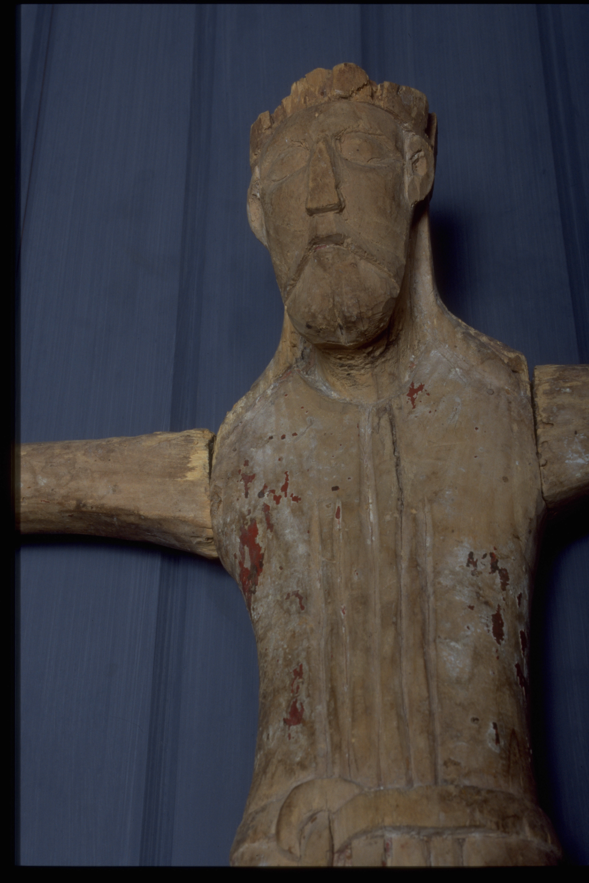 Kondition: höger fot avbruten, näsan avslagen, kronan skadad, korset förlorat. Färg: endast obetydliga fragment.