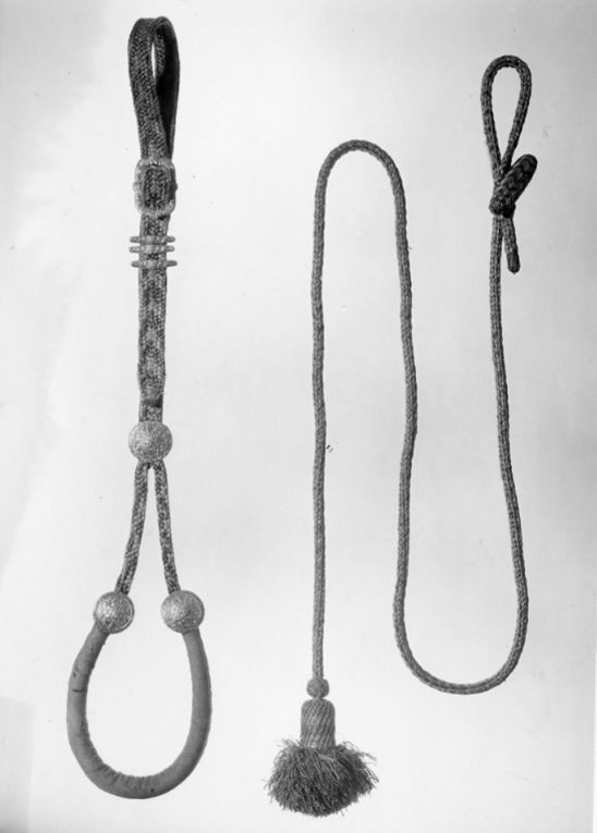 HandTygeln af GUld, Silfver, blått och Columbin färgat Silke tillhopaflätadt, med en Toffs af samma slag vid ena ändan, och en Knapp vid andra ändan.