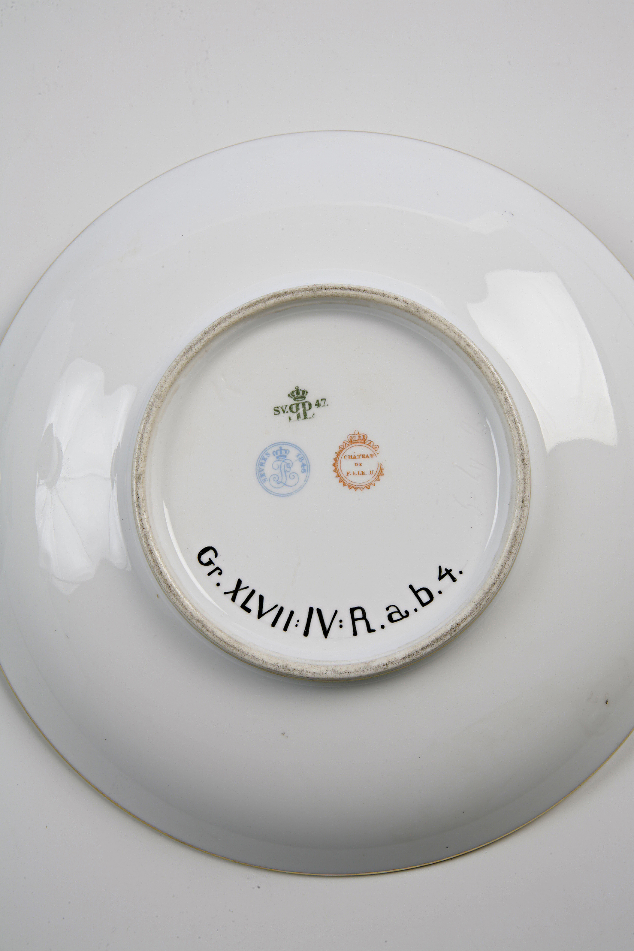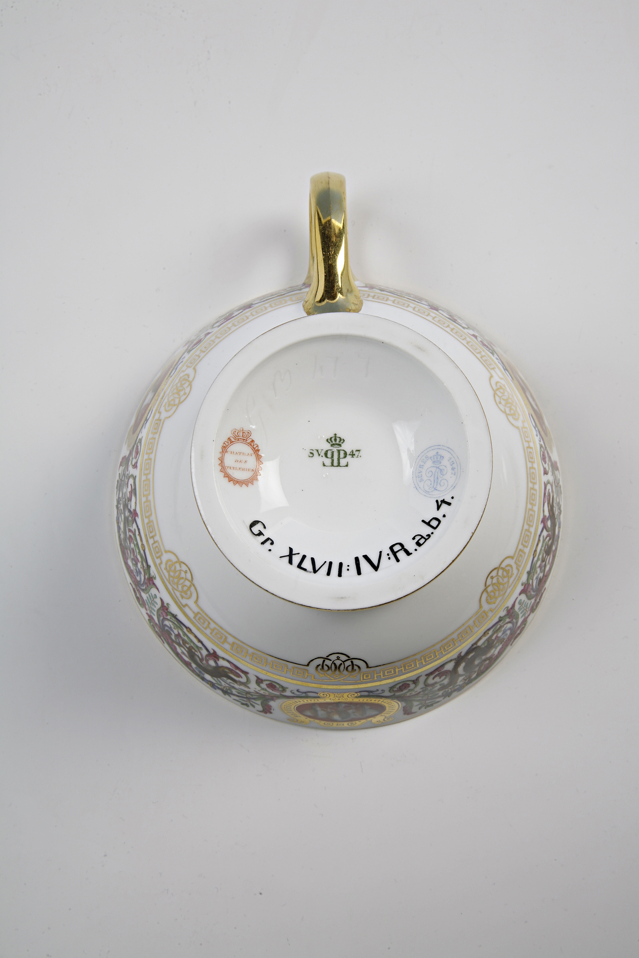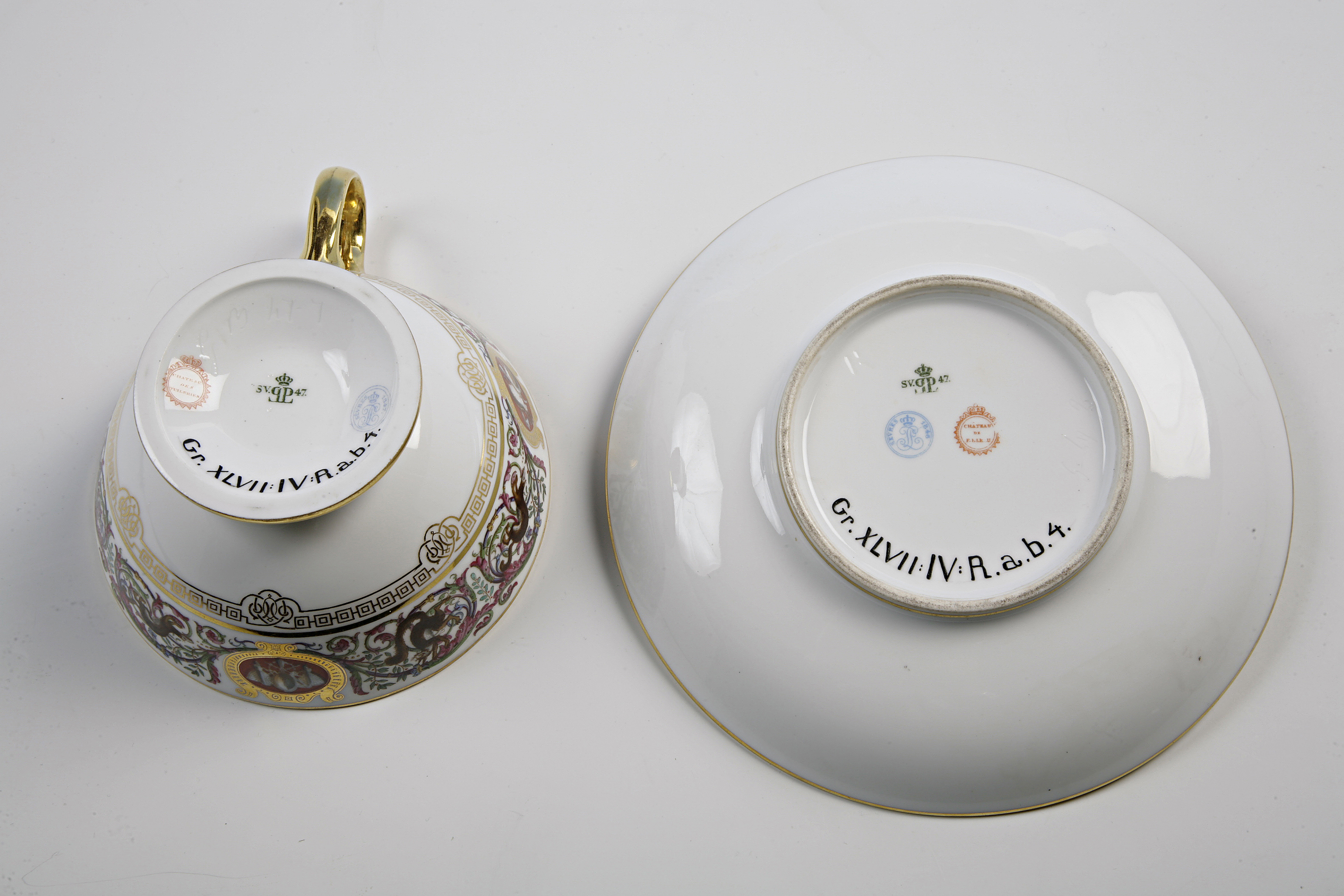Signatur/Påskrift: De två kopparna bär Tuiliernas slottsstämpel medan de två faten bär Fontainbleaus slottsstämpel. Kopp 1 har inristat hB 47-7och fabriksmärke SV LP 47 i grönt under glasyren, dekoratörssignatur i blått Sèvres LP 1847, slottsstämpel Château des Tuileries i rött. Kopp 2 med fat bär samma märkningar, fabriksmärket verkar dock ha suddats. Båda faten har ristat T 47-5 (1) fabriksmärkning som ovanstående samt slottsstämpel Château de Fontainebleu suddigt i rött.