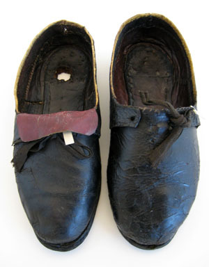 Skon är skuren i ovanläder och bakkappa med slejfar. Hälen är spannat. Skon har en rundad tå och är kantad med vit getskin. Plösen är bortsliten. Sulans undersida är sydd med en grov tråd och har en skarv. Klacken är 45 mm hög och gjort av fyra lagar läder.
