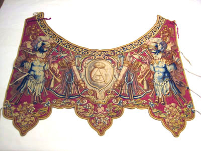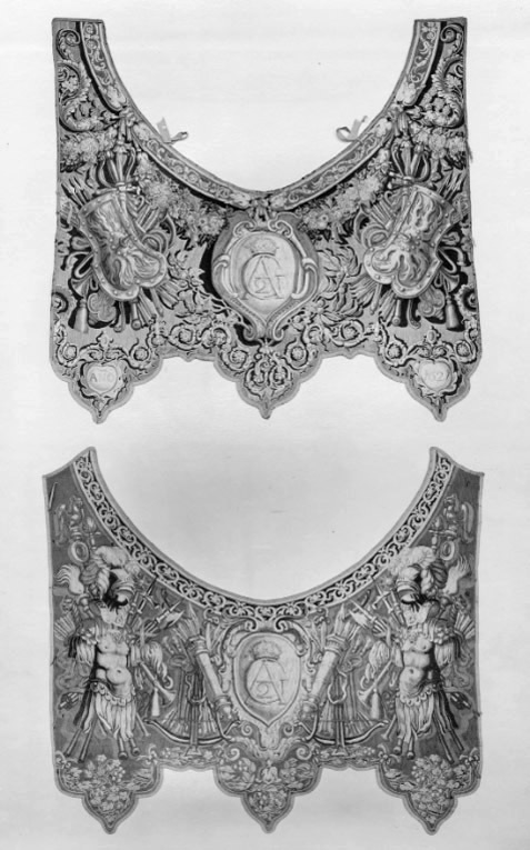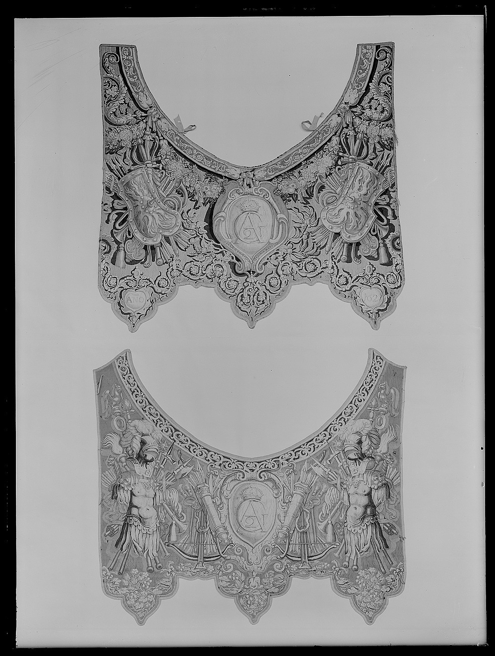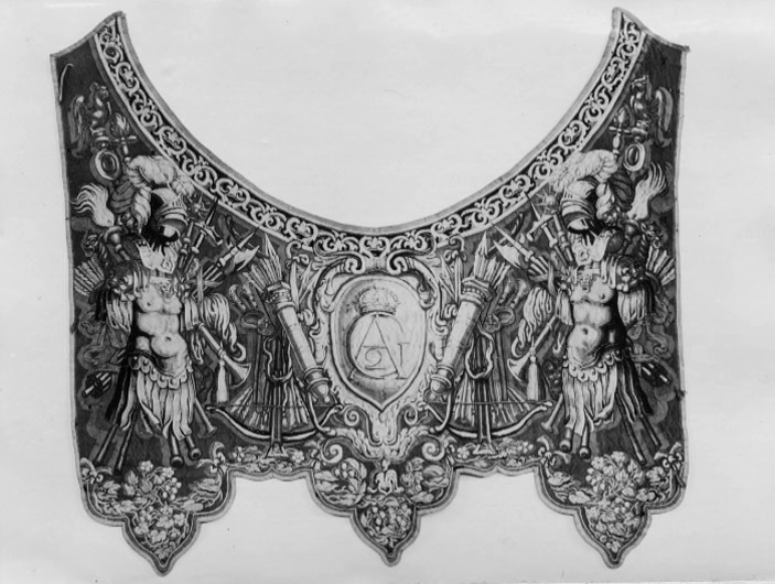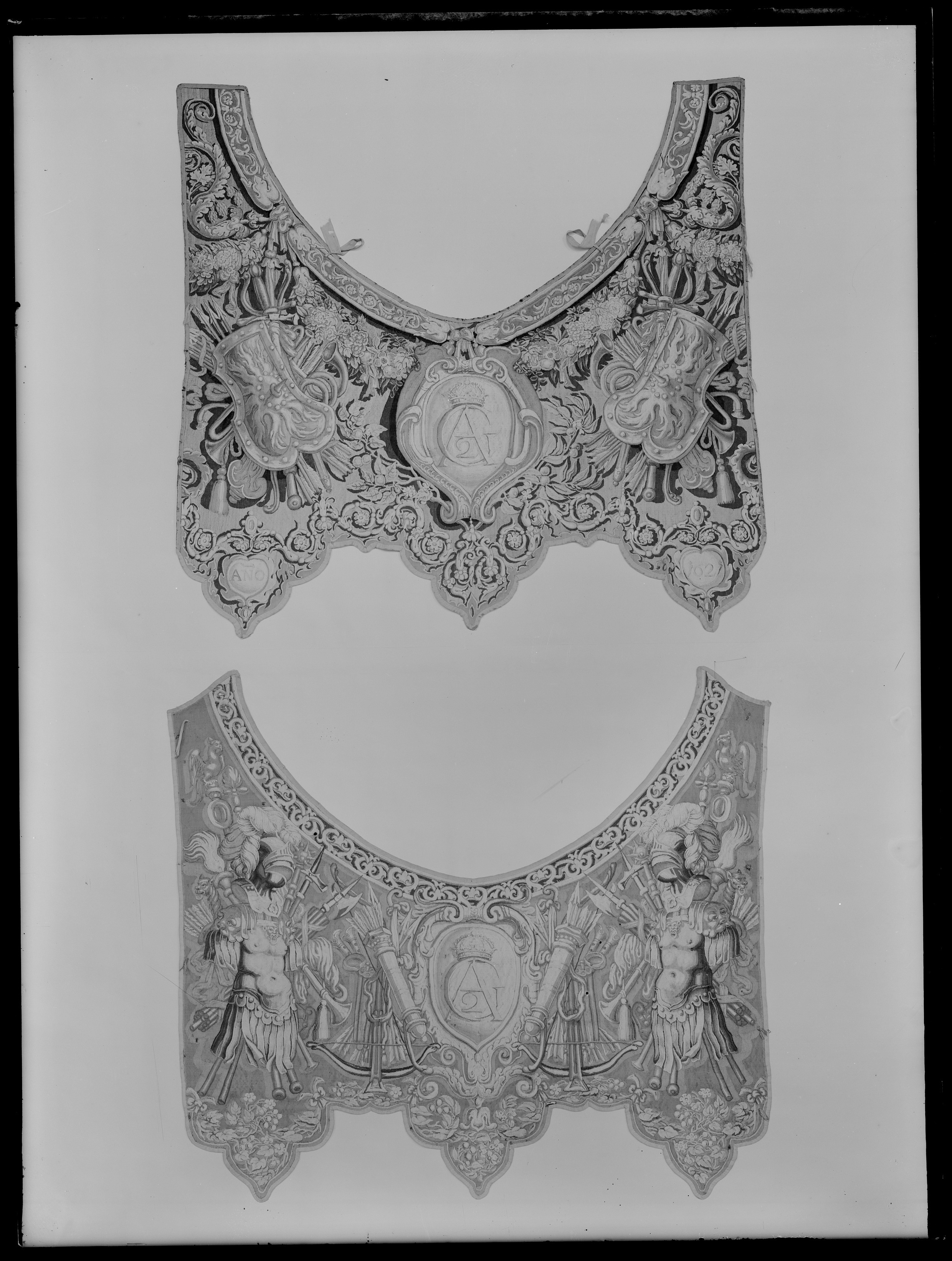 Två romerska hästtäcken, hvardera med halskappan och bröststycke, i gobelinsväfvnad af ull och silke, med ornamenter af trofeer, kronor och vapen, Gustaf II Adolfs namnchiffer samt "Anno 1621".