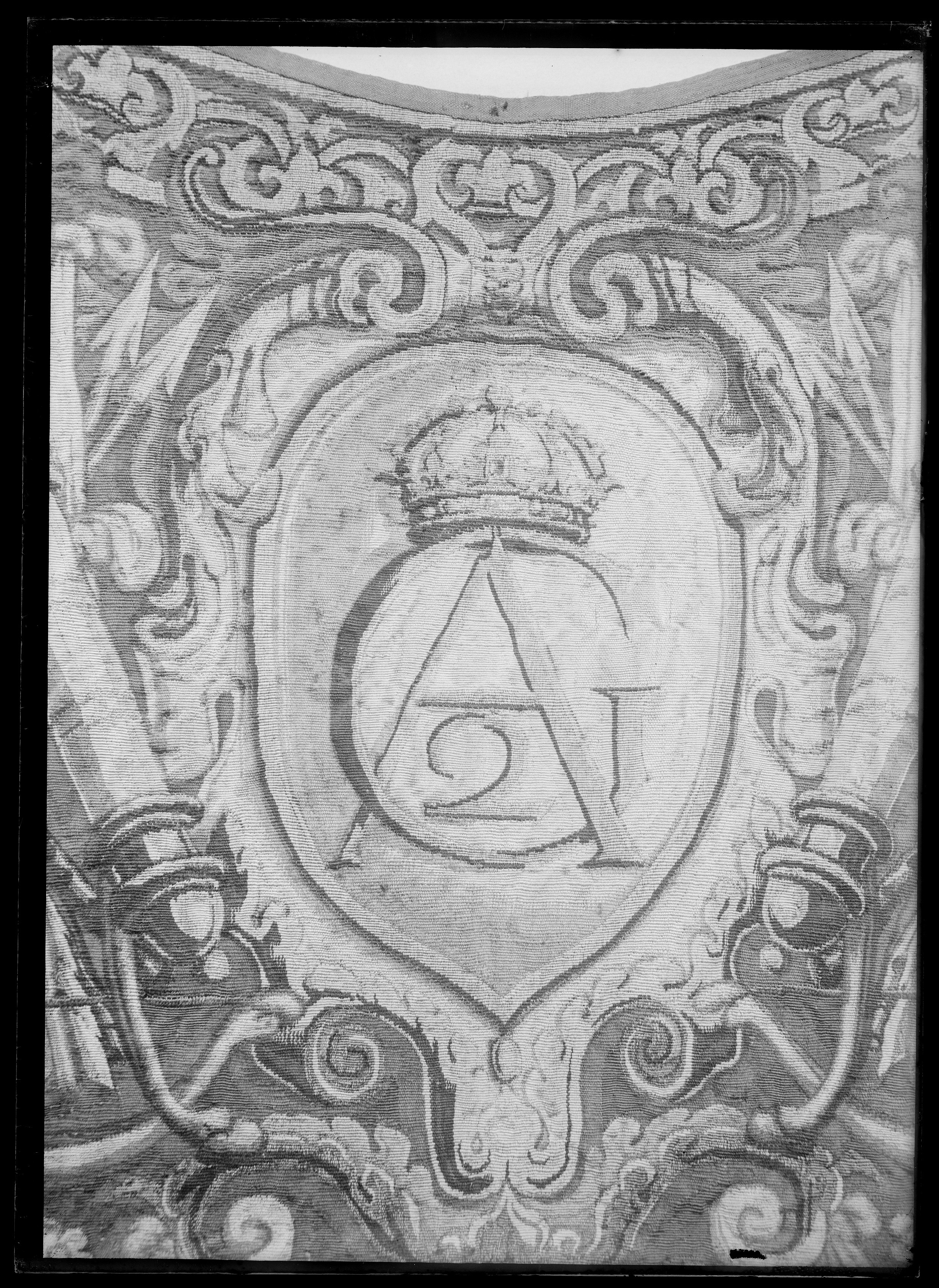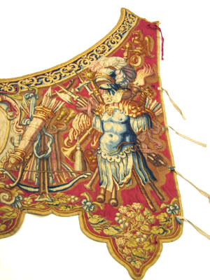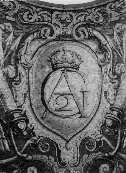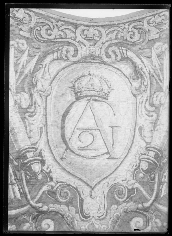 I Mitten är Gustav II Adolfs monogram invävd och på bägge sidor av monogrammet är båge, pil, romansk rustning med hjälm, krigsvapen samt överst en örn.