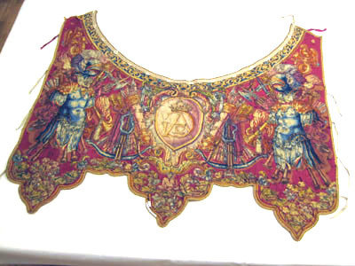 På den ena halskappan a) ett större hål. Den ena beklädnaden a) (med blå botten) lagad i Handarbetets vänners väfskola 1896 (se prot. 5.6.96.)