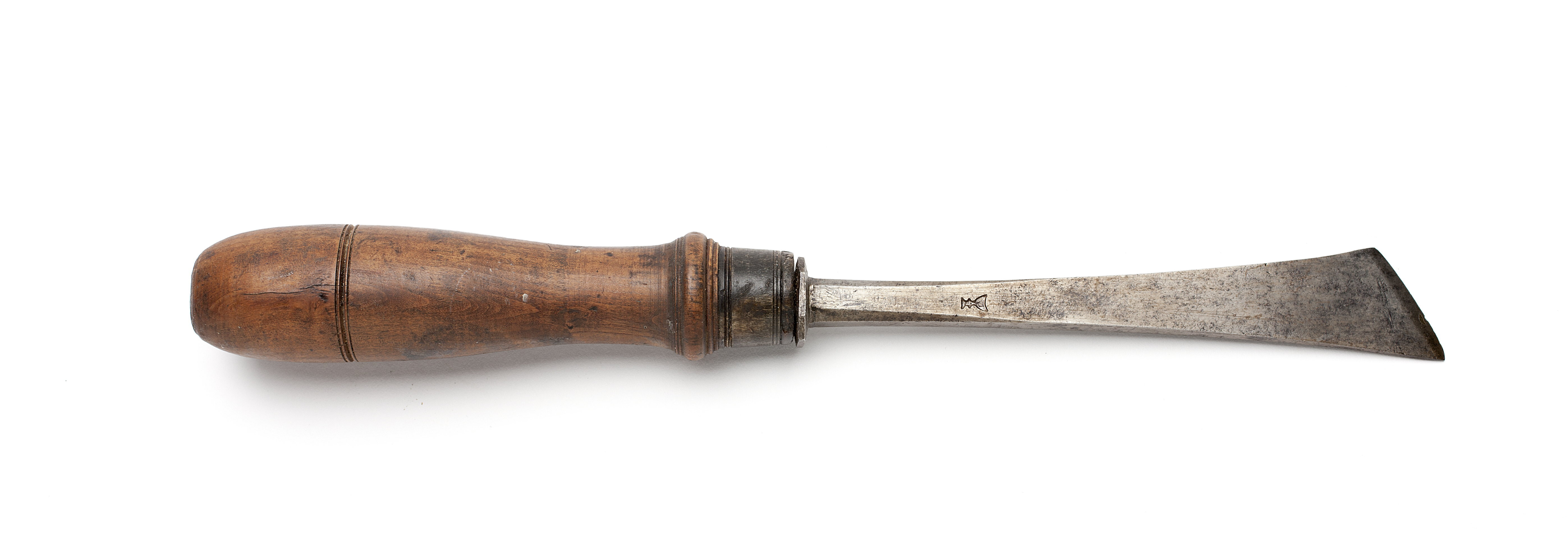 Klinga med rektangulär genomskärning, mot basen avfasade kanter. Sned egg. Stämplat på klingan: bägarliknande form. Svarvat skaft av päronträ, med en vulst nedtill. Hornring.