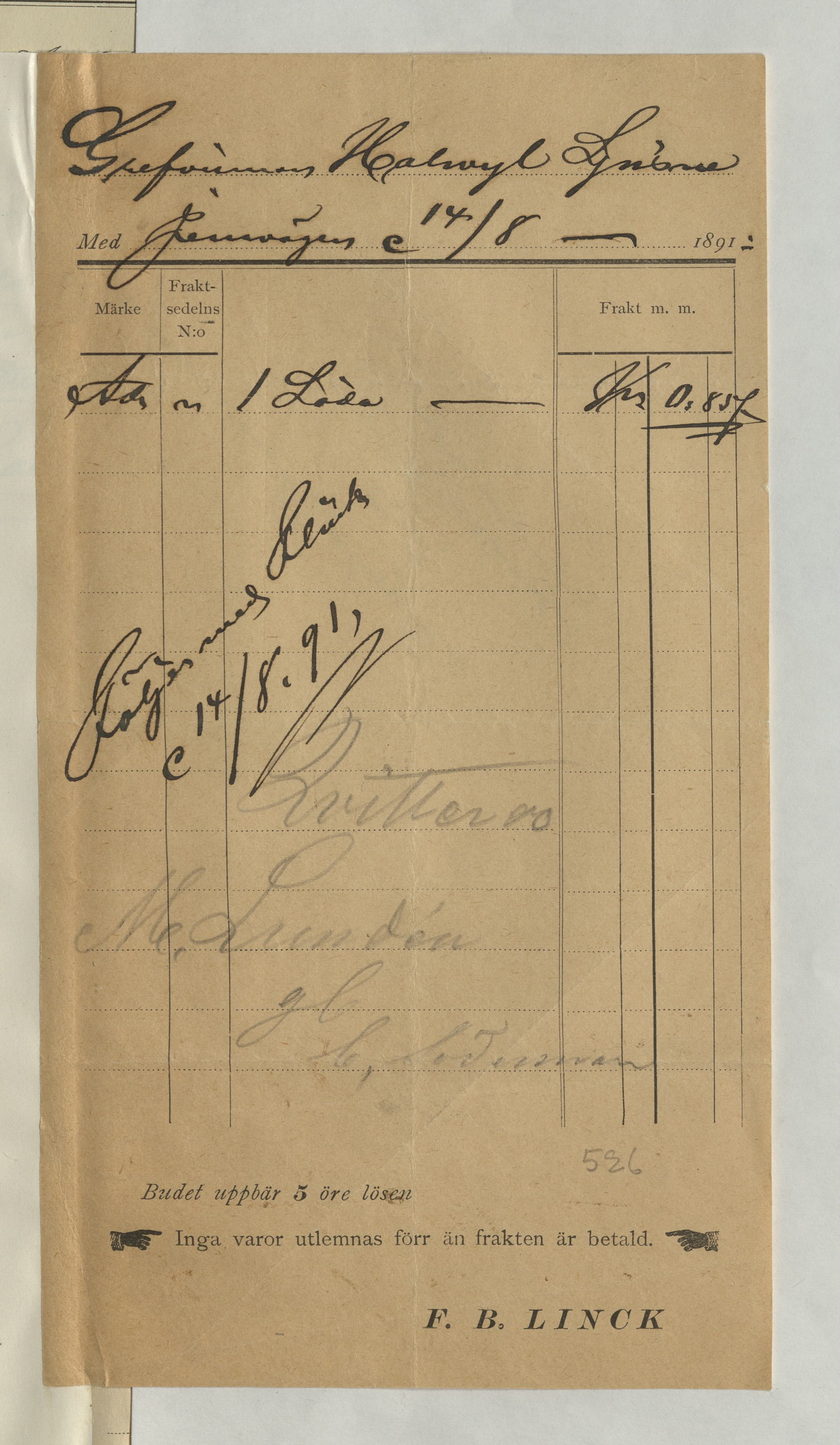 Kvitto från M. Lundin, Ljusne på 1 inköpt låda för 85 öre, av Grevinnan Hallwyl. Ljusne 14 augusti 1891.