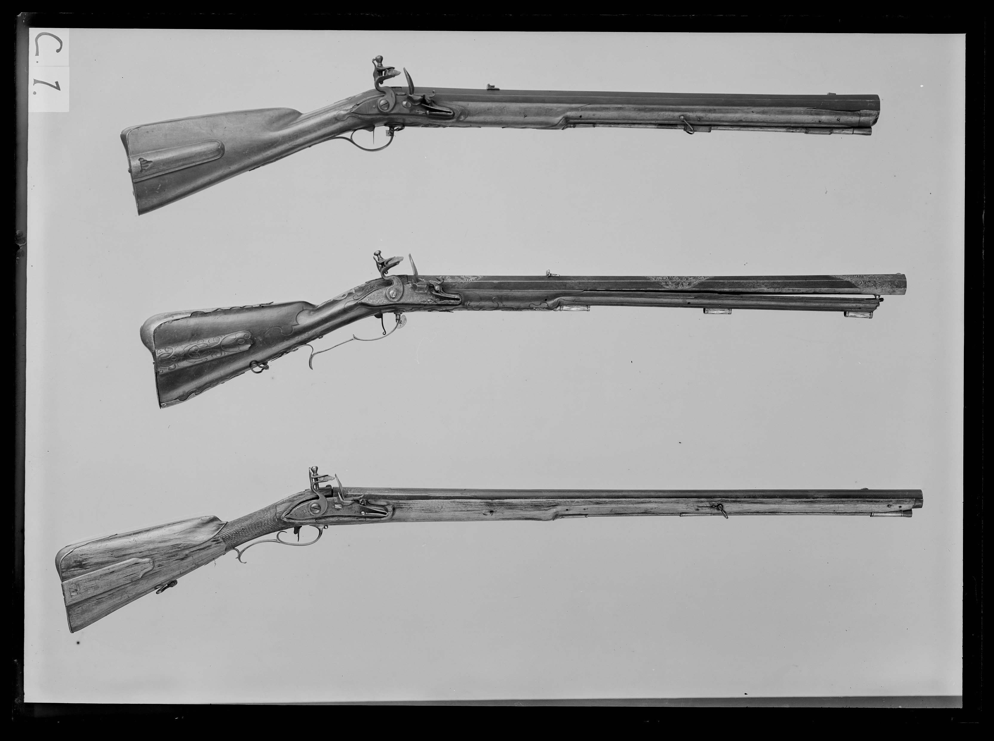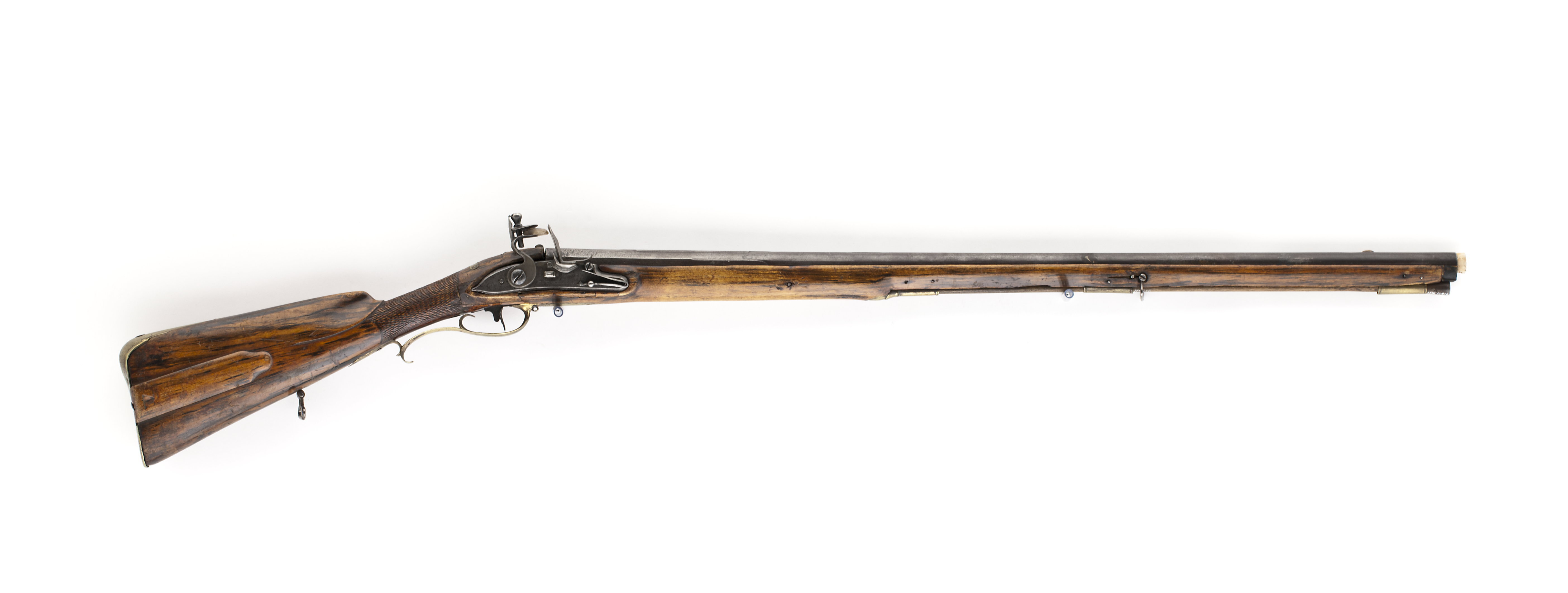 Rund, slätborrad, brunerad (?) pipa med siktribba i tre delar, avbruten på två ställen på kammaren, rundade ändar. Vid pipbasen två guldstämplar, den främre krönt: "GE // R // HAR // D", den bakre ett lejon med pil i framtassen (Stöckelnr 429-430). På den mellersta ribbdelen punsat: "IHF". Böjt svansskruvblad med rundat ändblad. Riktmedel: Spolformigt korn av silver, vid pipbasen klack med brett, skålat sikte. Fästning: Tre häften, pipan fäst med krysskruv, bakre låsskruven genom svansskruvplattan samt tre pipstift av stål. Flintlås med plant låsbleck, fasade kanter, delvis utplånad, graverad signatur framför hanen: "GERHARD // A STOCKHOLM". S-formigt svängd, platt hane (ej ursprunglig), smala, ovala käkar, käkskruv med koniskt huvud. Fasetterad fängpanna med fals. Batteri med fasetterat fängpannelock och eldstål med fasad åsning, svagt uppåtsvängd häl. Batterifjäder med fasade kanter, rester av fjäderlöv. Nedanför fängpannan skjutsäkring med rektangulärt, skadat huvud. Fästning: Två låsskruvar. Rak avtryckare. Helstock av brun-svartflammig valnöt (ask ?), kolv med nätskuren kolvhals, kindstöd och kolvlåda, näsband av horn. Beslag av mässing, bakplåt med framåt avsmalnande flik på kolvryggen, smala kantlister. Slätt sidbleck (ej ursprungligt). En + två släta rörkor,, kort, slät spets. Konturerat avtryckarbleck av stål. Varbygel av mässing med mittfält på bygeln, omvänt c-formig bakre stolpe, fri bakre arm, nedsvängd vid stolpen, avslutning i form av svagt konturerat, droppformigt blad. Konturerad, välvd främre arm med kantdekor i rokoko. Vid framstolpen ring för fästning av rembygel. På kolvens undersida bakom varbygeln inskruvat en rembygel av stål, den främre fäst framför mellersta pipstiftet. Tillbehör: Laddstock av trä, l: 820 mm, framtill skodd med horn, l: 23 mm.