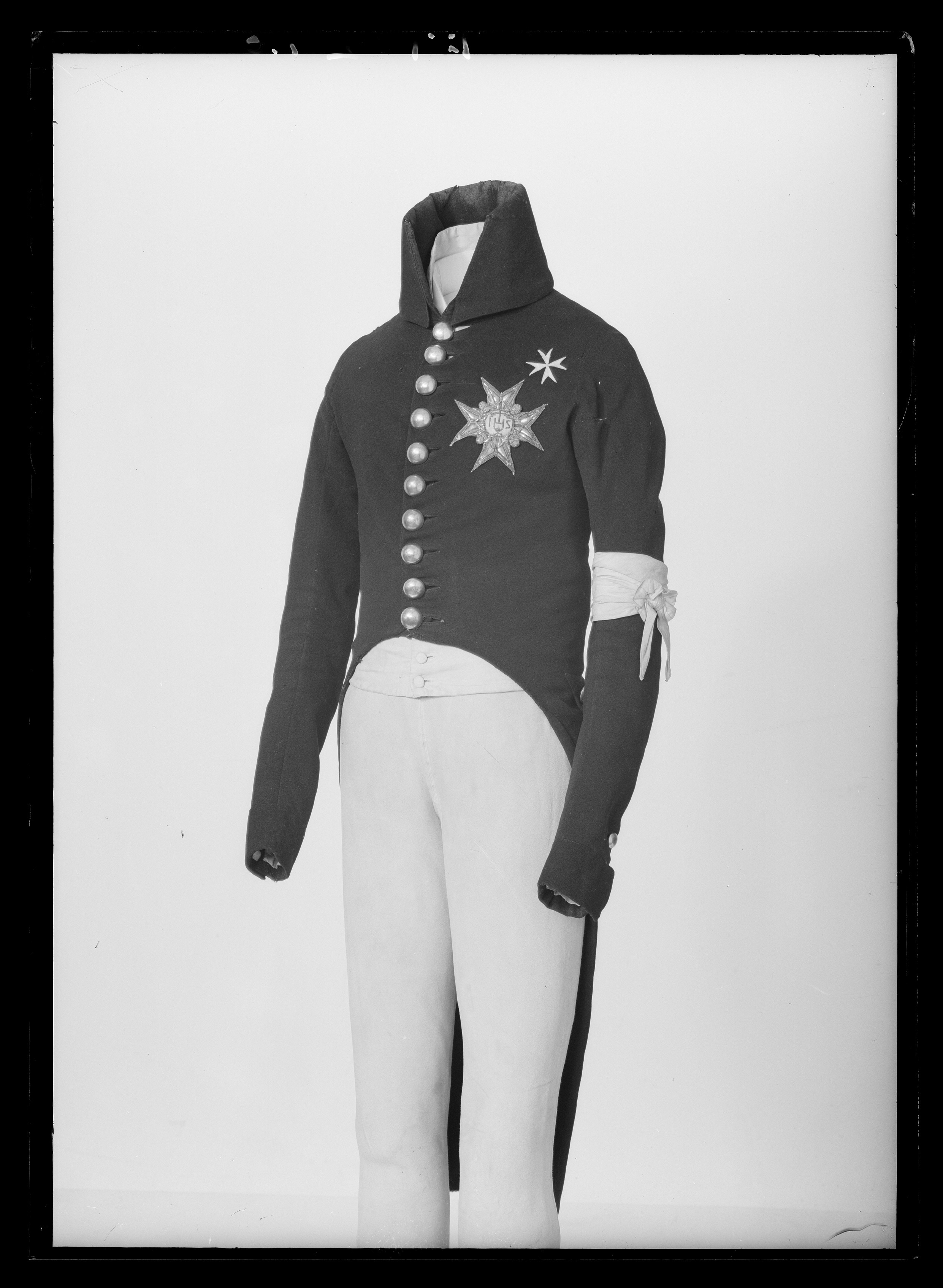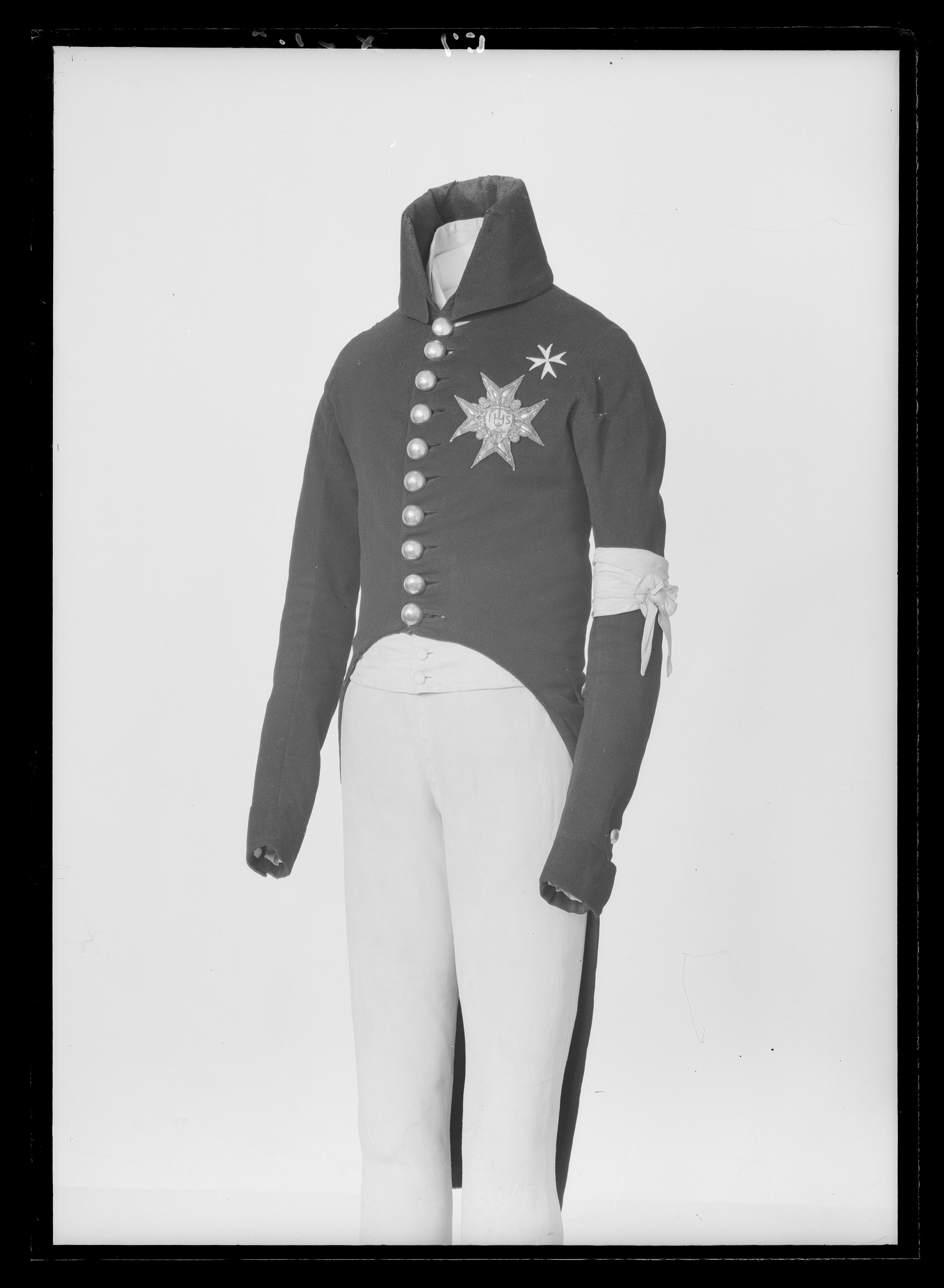 Livskuren uniformsrock av blått kläde med ett smalt midjelångt liv från vilket två långa skörtkappor, 656 mm långa, hänger ned bak. Rocken har bakåtskurna framkanter med en enkel knäppning mitt fram bestående av tio runda, förgyllda mässingsknappar med motsvarande knapphål, 30 mm breda. Höger framstyckes framkant markeras med en stickning. På insidan av vänstra framstycket sitter en 55 mm lång slå av blått kläde. Hög ståndkrage, 133 mm, med slag. Långa smala ärmar, 670 mm långa, med uppvikta slag, 58 mm breda. Ett ärmsprund, 110 mm, knäppt med två mässingsknappar, från början tre knappar, samt tre knapphål, 20 mm breda. Vid vardera ärmhåla sitter en kil av blått kläde. Ett 555 mm högt sprund mitt bak mellan de två skörtkapporna. Skörten veckar sig och bildar en skörtficka. Skörten är uppvikta på sidorna. På den högra skörtkappan sitter en rund, förgylld mässingsknapp. I nederkanten på bakstycket av livet sitter två horisontella, dekorativa ficklock, 160 mm långa och 64 mm breda. Ficklocken är snedvinklade i kanten och nedtill spetsformade. Vardera ficklock omges av sju knappar samt två knappar mellan ficklocken dvs mitt på ryggen. Livet och skörtkapporna är fodrade med svart siden medan ärmarna är fodrade med vitt linnetyg. Livet har även ett mellanfoder av blått kläde. Fodret är vid axelpartiet matelasserat. På vänster bröst sitter serafimerordens kraschan nnr 18971, diam 100 mm, broderad i relief av silvertråd, silverlan, silverpaljetter samt ljust blått siden. Ovanför serafimerorden sitter Johanniterordens kors nnr 18972, diam 40 mm, av vitt linne kantat med stygn av vit silkestråd. Runtom vänster ärm sitter revolutionsbindeln knuten nnr 31277. Armbineln är av tunt vitt linne kantad med en smal fåll, 1 mm.