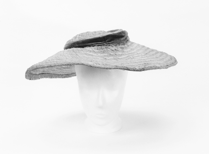 HATT Hatt med kulle och breda brätten. Naturfärgat strå med ljusbrunt sammetsband runt kullen. Ripsband innuti. Etikett "Chic Parisien Grevturegatan 14 Stockholm". Tillhörande HATTNÅL med vit kula Har tillhört Ellen Roosval. Gåva 1952 från professor Johnny Roosval (protokoll 82 º 5 ).