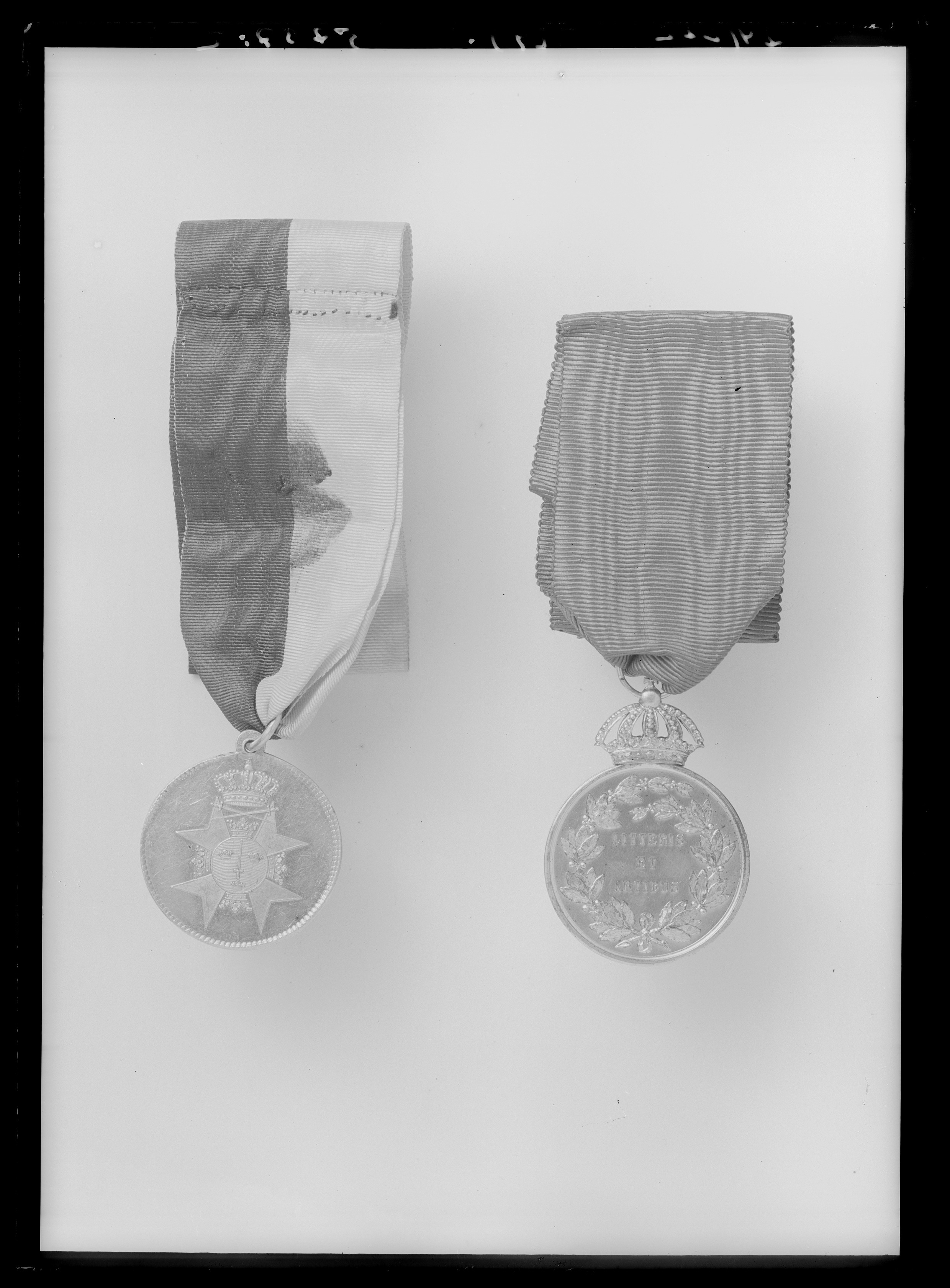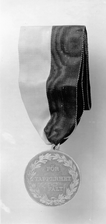 Åtsida: Svärdsordens riddarkors. Frånsida: Lagerkrans, text: "FÖR // TAPPERHET // I FÄLT". Upptill ögla, däri fäst oval, spiralformig bandring.