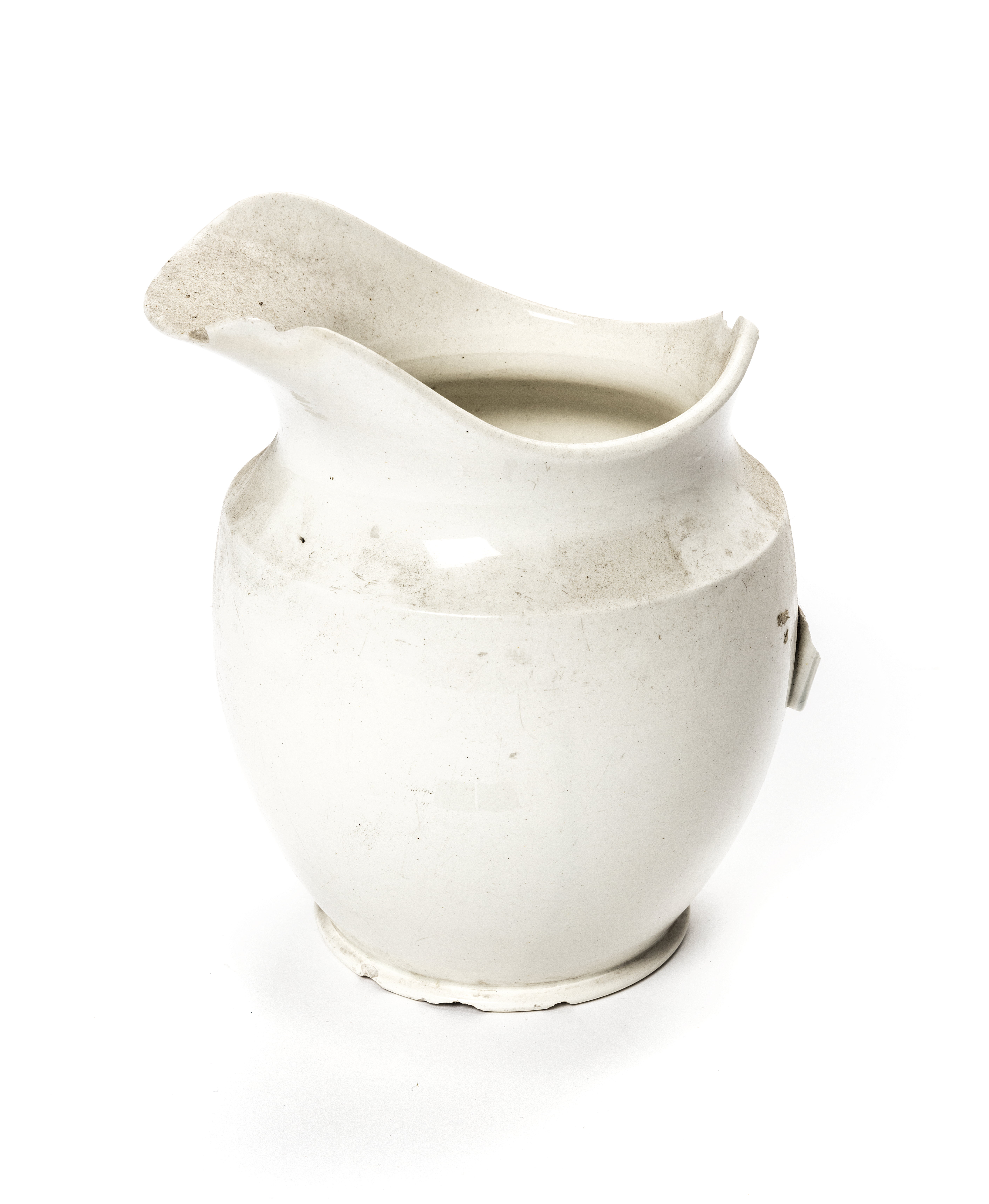 Troligen Rörstrand, 1830-50. Handtaget borta, flisor ur foten och kanten borta.