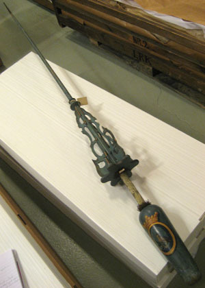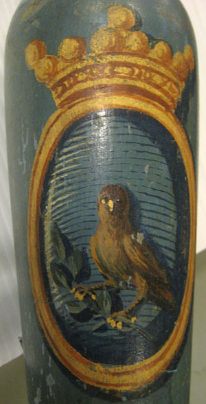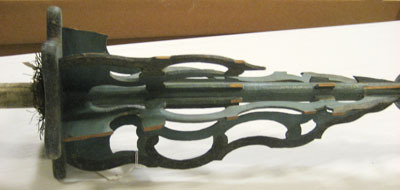 Lans bestående av kolv, handtag, stödskiva, vingar, holk, spjut och spets. Lansen målad i blå grundfärg. Bakåt avsmalnande cylindrisk kolv med rundade ändar. Kolven dekorerad med grevliga ätten von Essens hjärtsköld med randad blå botten med en brun uggla med gul näbb och gula klor som sitter på en avhuggen pinne med gröna blad. Skölden är oval och har en guldfärgad ram samt är krönt av en friherrlig krona i guldfärg. Handtaget är klätt med vit sidendamast. I handtagets båda ändar finns fransar av tvinnad guldtråd. Stödskiva av trä i form av sexuddig stjärna med rundade kanter, blåmålad. I skivan och stången intappat sex tunna bräder (vingar), kontursågade och genombrutna, målade i blått med mörkblå kanter. Vingarna konturerade i tre runda bågar, avsmalnande uppåt spjutet. Svarvad balusterformig holk, blåmålad. Framåt avsmalnande spjut, blåmålat. Spets av järn? med konisk holk, 168 mm lång och spets, 27 mm lång.