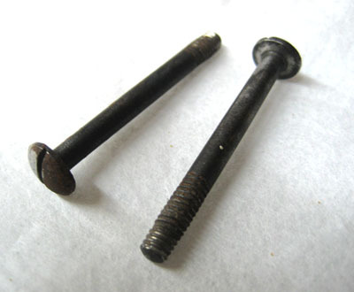 Låsskruvar, två stycken, av svärtat stål med kullrig skalle och spår. Nertill gängad till en längd av 6 mm.