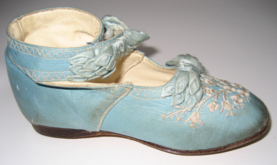 Skon med rak läst är skuren i ovanläder och ett bakstycke som är hopspannad mitt bak. Delarna förenas med dubbla sidsömmar. Skon är helfodrad med benvitt getskinn. Innersulan är av samma material. Slejfen, 16 mm bred knäpps med en liten vit pärlemorknapp. Knäppningen döljs mitt fram av en ljusblå sidenrosett, längd 62 mm. Runt skons öppning samt runt slejfarna löper en dekorsöm i benvit silke, bredd 4 mm. I skons öppning mitt fram finns en ljusblå sidenrosett, längd 40 mm. Mitt fram över tåpartiet är skon prydd med ett blombroderi av benvitt silke. Skons klackkudde är 7 mm hög och har målats mörkbrun. Yttersulan är av sämskat, ljusbrunt läder med med ett litet pinnhål itrampet, under hålfoten och ett under hälen.