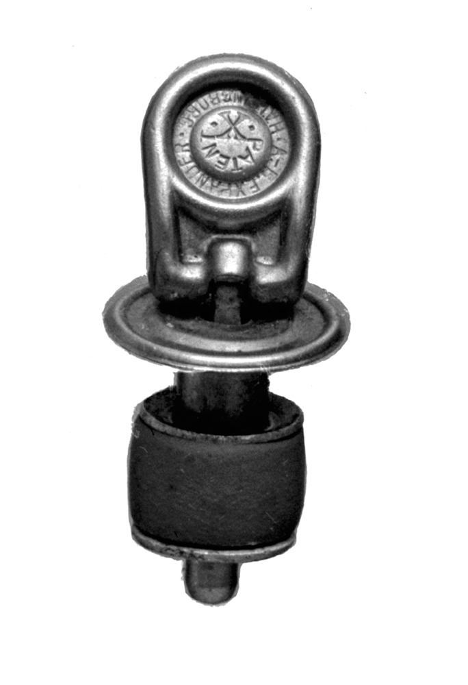 PATENTKORKAR, två stycken Av tennlegering och gummi. Bestående av en tjock röd gummiring, fäst mellan två flänsar på en genom ring och flänsar gående ten med nedre flänsen skruvbar på tenen i ett från denna nedåt utgående kort rör; från övre flänsen utgående uppåt ett kort grövre rör samt ovanpå detta en bricka, täckande flaskhalsens mynning. På tenens övre ände ett fällbart platt handtag (tumtrycke), som då det nedfälles, sammanpressar flänsarna, så att gummiringen utvidgas och tätar flaskhalsen; handtaget med rundad överände och stavformig kant, pressad från baksidan.. Längd: 5,8 cm.; diameter: 2,4 cm. Flänsar, diameter: 1,3 cm och 1,7 cm. Svensk tillverkning, Helsingborg; Aktiebolaget Expander.