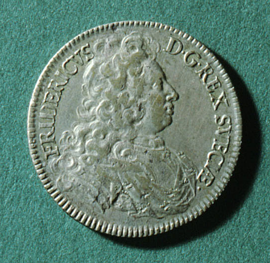 Kastpenning av silver, 7,5:e storleken, från konung Fredrik I:s (1676-04-17 - 1751-03-25) kröning i Storkyrkan, Stockholm 1720-05-03. Åtsida: Fredrik I, låg relief, bröstbild, profil h, peruk, harnesk kronbeströdd mantel, text: "FRIDERICVS D.G.REX SVECIAE". Frånsida: kunglig krona, text: "SACRVM VIRTVTIS PRAEMIVM D.3.MAII.A.1720". Räfflade kanter och snedräfflad rand.