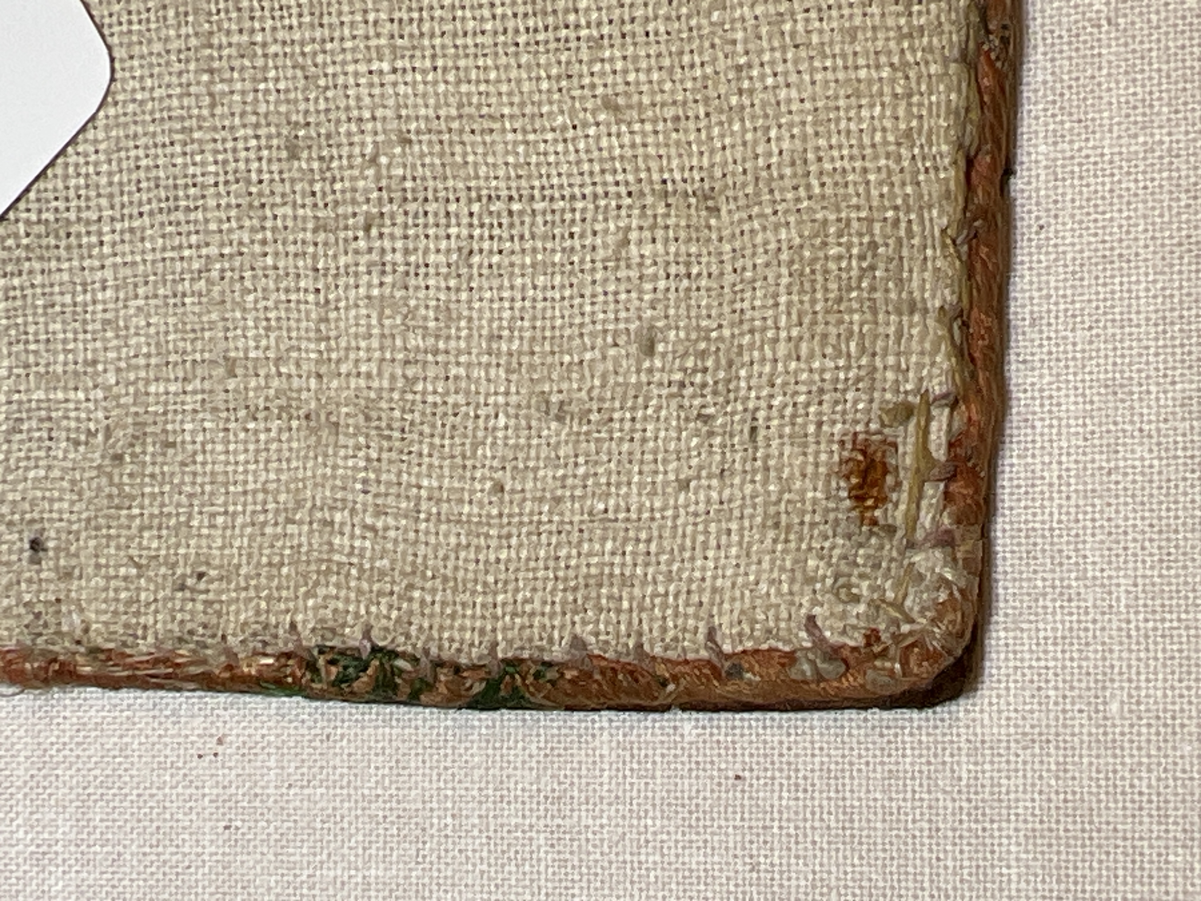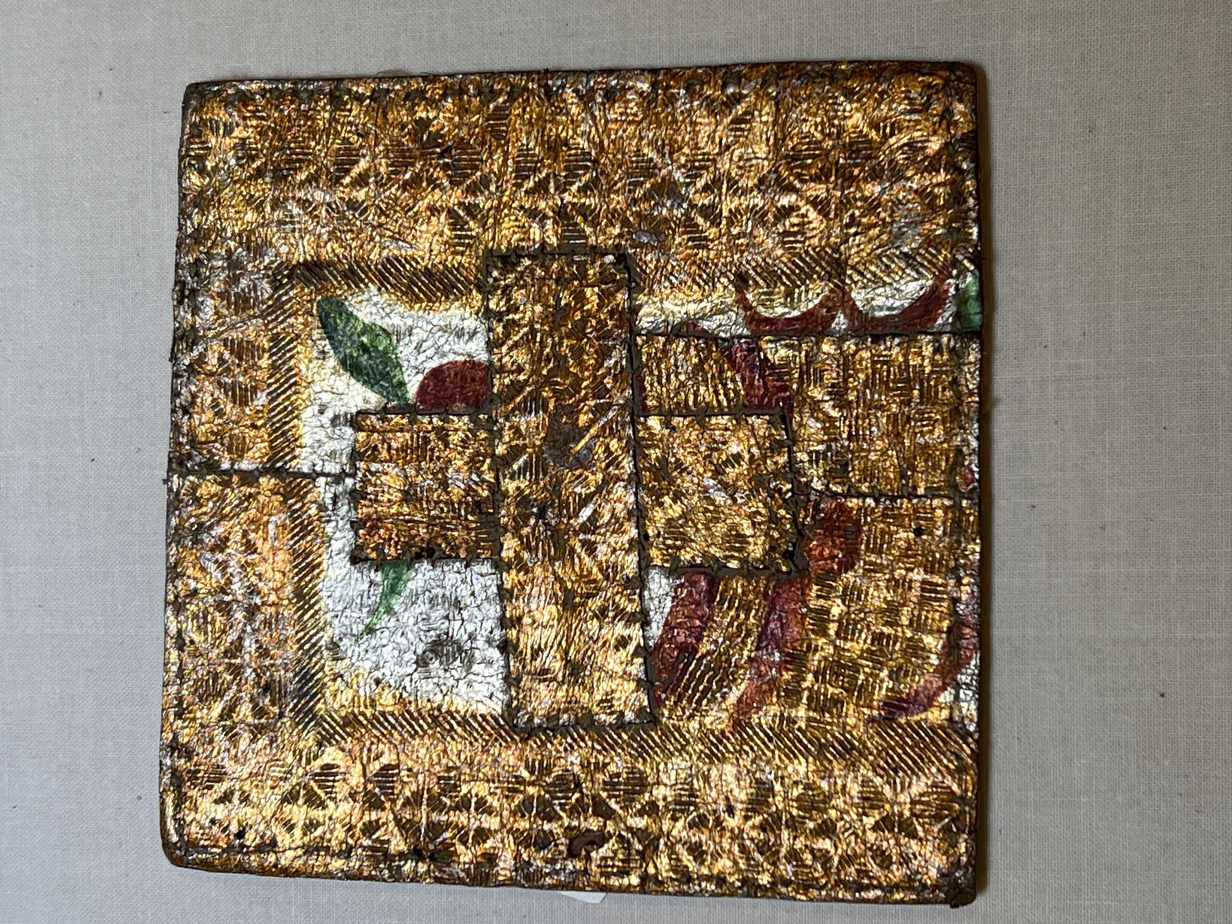 Gyllenläder med silverbotten präglat i olika mönster. Målad blomdekor i guld, rött, grönt och blått. Applicerat kors av gyllenläder, guldmålat. Kantas av målade bårder i guld. Foder av vit lärft. Deposition från Nordiska museet 1998 (Nm 42.800).