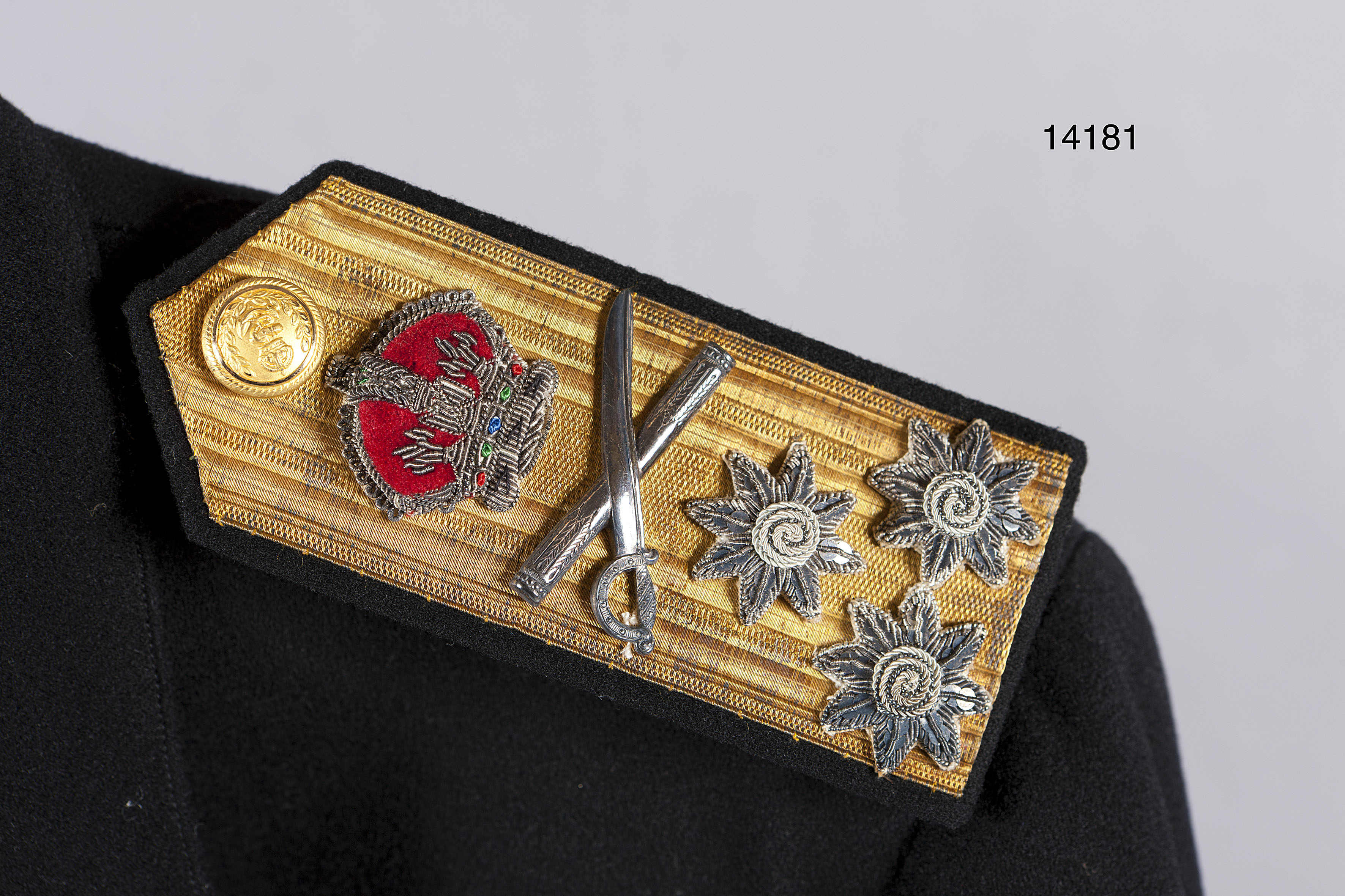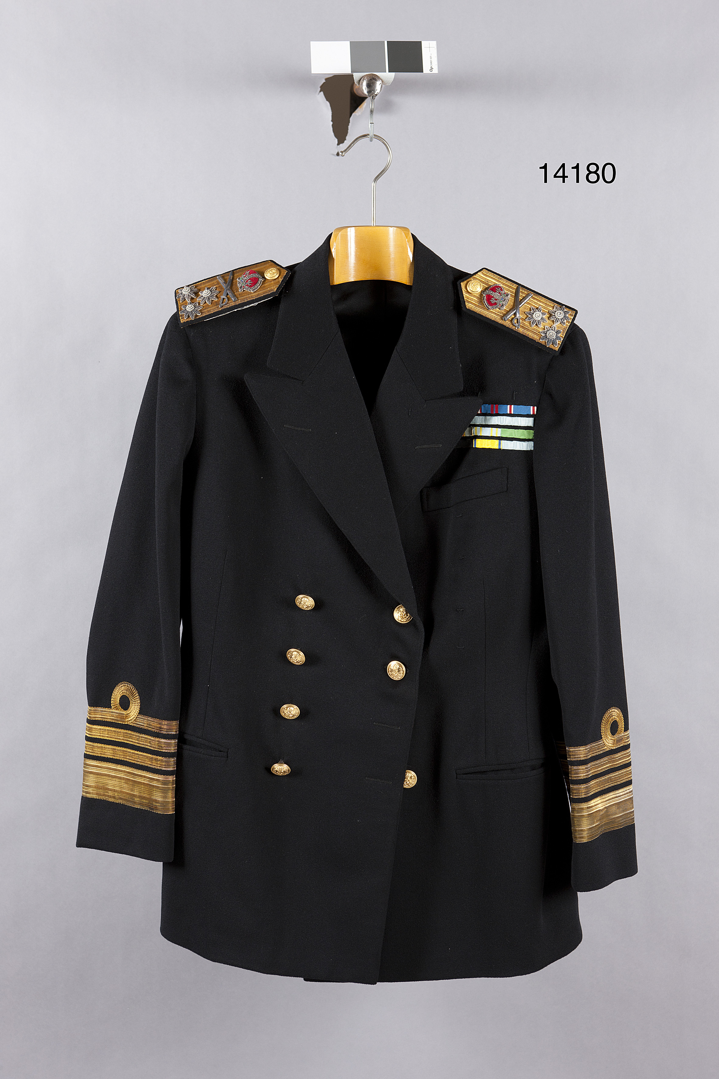 Rock av svart kläde, fällkrage, dubbelknäppt med i varje rad fyra mässingsknappar med krönt ankare och bladkrans. På vardera slag ett knapphål. I sidorna, ovanför fickorna, tre tygsömmar. Ryggen sydd i två våder. På båda sidor en stor ficka, i den högra en liten biljettficka. På vänster sidan en bröstficka. På axlarna en hälla samt en påsydd metallögla för axelklaffarna. Isydda raka ärmar med nedtill en bred, 45 mm samt tre smala, 15 mm, guldgaloner, varav den översta beskriver en cirkelformad ögla på ärmens utsida. På vänster slag samt under bröstfickan en resp. fyra tränsar. Ovanför bröstfickan fyra rader släpspännen. 1. Bathorden 2. Kungliga Victoriaorden 3. Georg V:s och drottning Mary´s av Storbritannien kröningsmedalj. 1911 (?) 4. Georg VI kröningsmedalj 1937 5. Oscar II:s och drottning Sofias guldbröllpsminnestecken 6-7. Gustav V:s jubileumsminnestecken 8. enfärgat ljusblått (Strumbebandsord.) 9. Kronprins Gustavs och kronprinsessan Viktorias silverbröllopsmedalj. 10. Gustav V:s olympiska medalj. 11. Vasaorden. 12. Nordstjärnan 13. Svärdsorden 14. Serafimerorden Sydd hos A.B. Nordiska Kompaniet Stockholm, 1951.