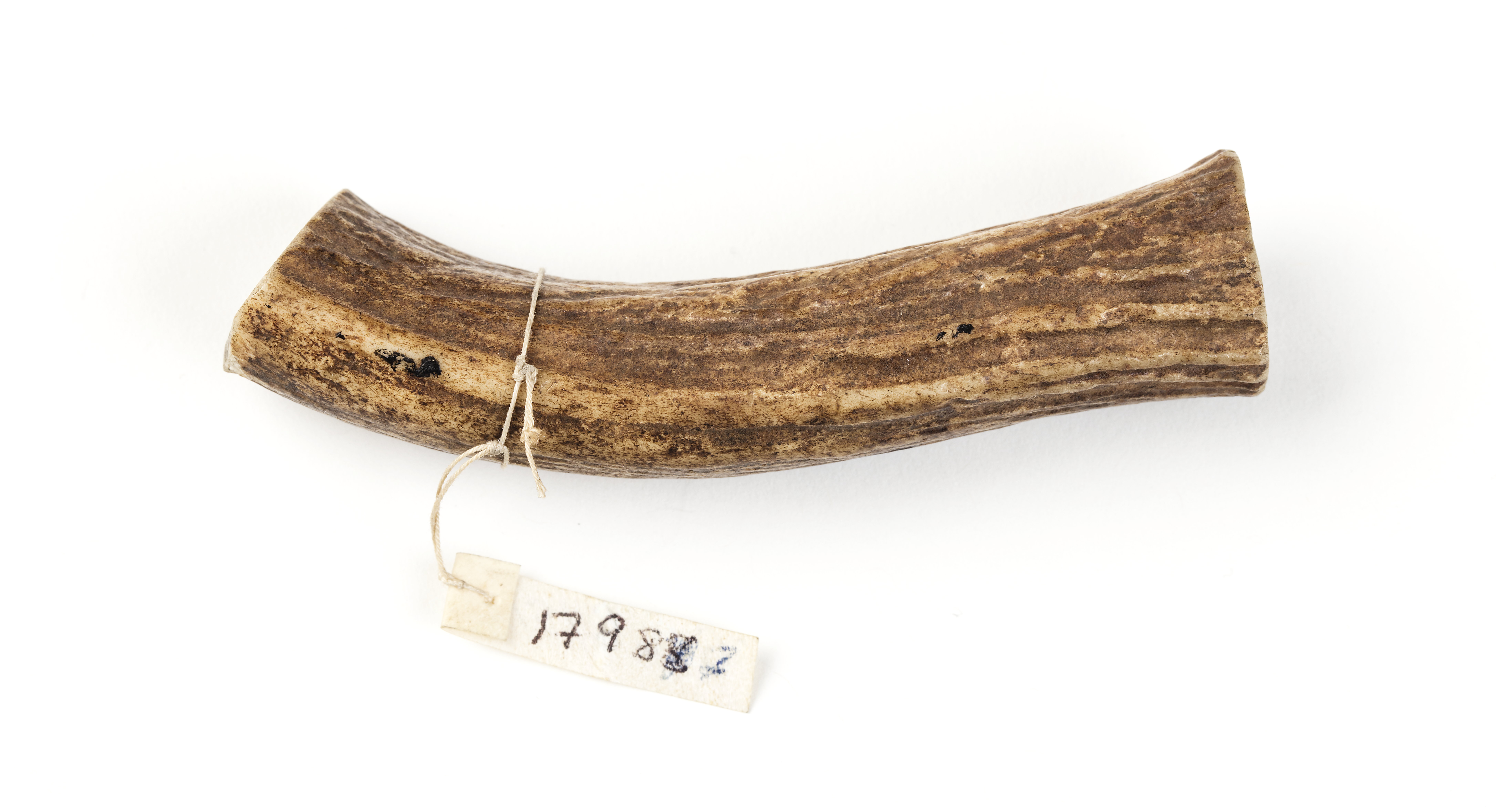 Del av ett dovhjortshorn, obehandlat. Ytan naturligt skrovlig med brunaktig färg. I bägge ändar avsågad med genomgående hål på längden.