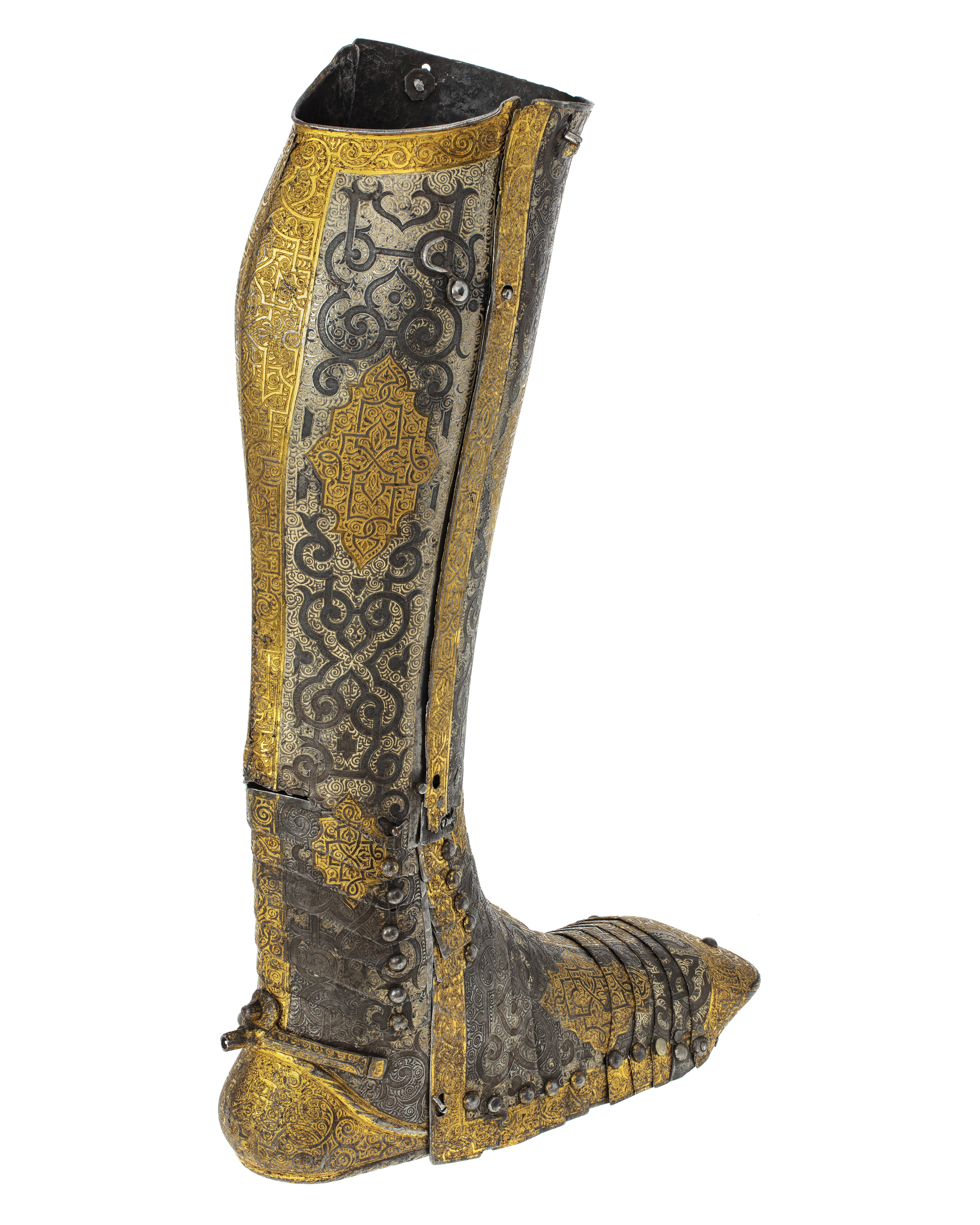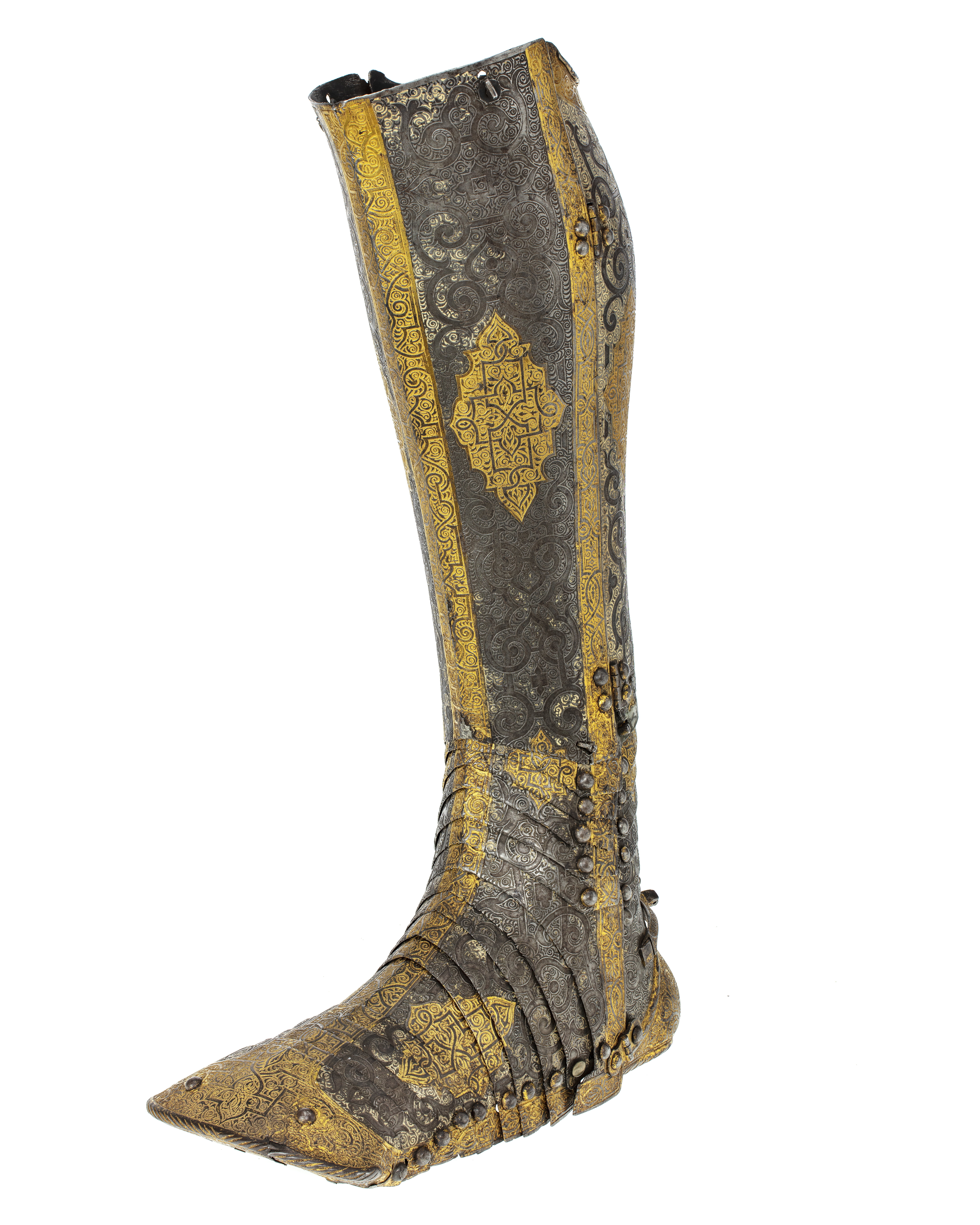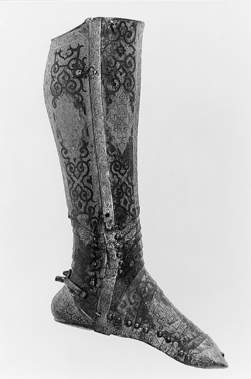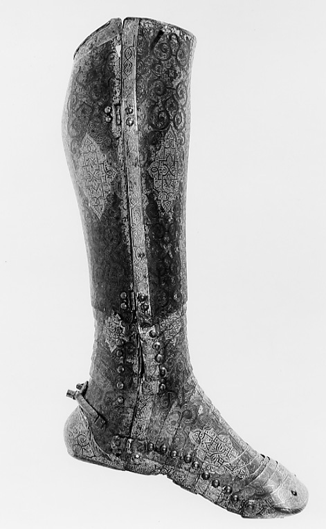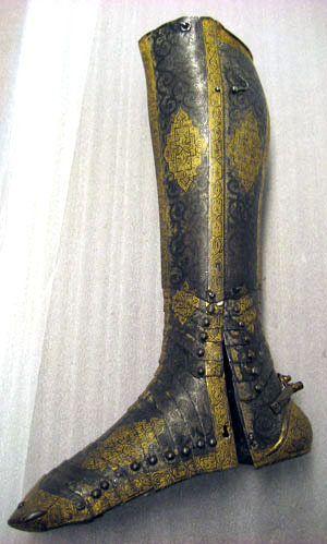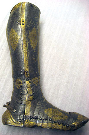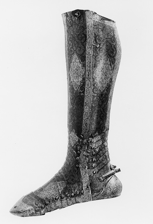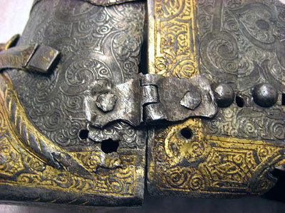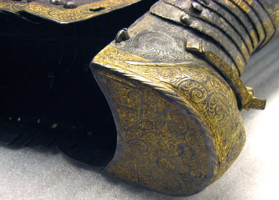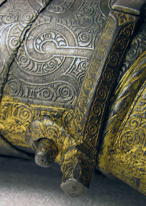 - 1 rustning af jern, helt och hållet etsad i ornamenter, hvilka äro dels förgyllda dels ifyllda med en hvit massa, rustningen, som uppgifves hafva tillhört konung Christian II, består af: hjelm i 5 delar med slutet visir, hakbetäckningen att öpna på midten, kammen hög, starkt bakåtsluttande, för hjelmbusken en hylsa, muttern på ena sidan af visiret jemte knappen till fjedern på öfre visiret borta, hjelmen invändigt fodrad med stoppning, öfverklädd med sidensars,