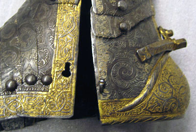 2 Complette Armstycken af drifvit incrusterat Jern med Guld och Silfver