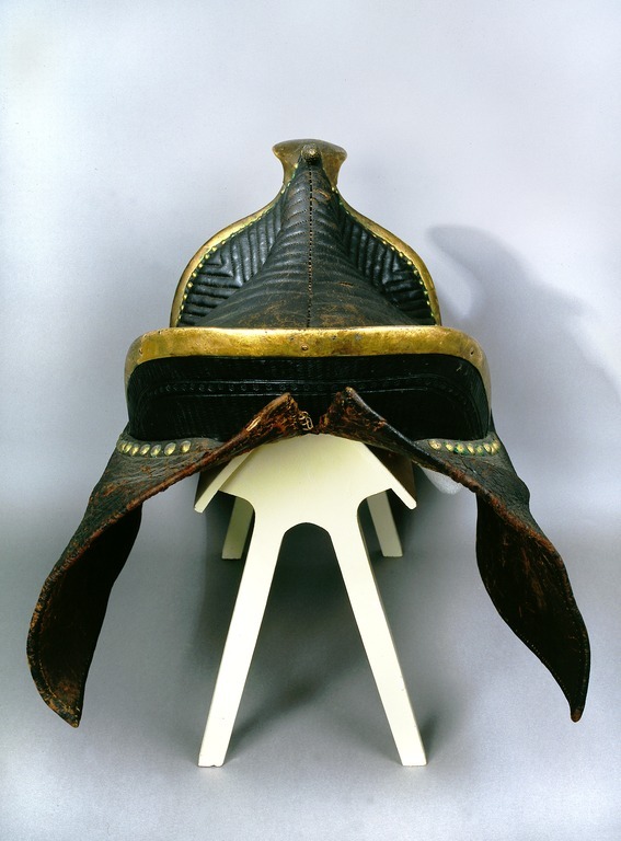 Sadel av svärtat läder, sitsen och bommarnas insidor med mönsterstickningar. Rektangulära kappor med dubbla, nedsydda kantstickningar samt sköldformiga stickningar från sitsen och nedåt. Sitslängd: 330 mm. Frambom, b: ca 300 mm, h: 50 mm med kraftig kant av förgylld mässing, på insidan med täta tännlikor av förgylld mässing. Bakbom, b: 330 mm, h: 100 mm av samma utförande som frambommen. Frambommen på mitten upp-och framåtböjd i en plan, rundad sadelknapp av förgylld mässing. Från denna en bakåtriktad pinjekotte av gjuten, ciselerad och förgylld mässing. Framför frambommen 11 tännlikor, bakom bakbommen 10+10 tännlikor av samma material. Bom klädd med ljusbrunt läder och näver med rektangulära hål för stigläder. Framtill ögla av läder.