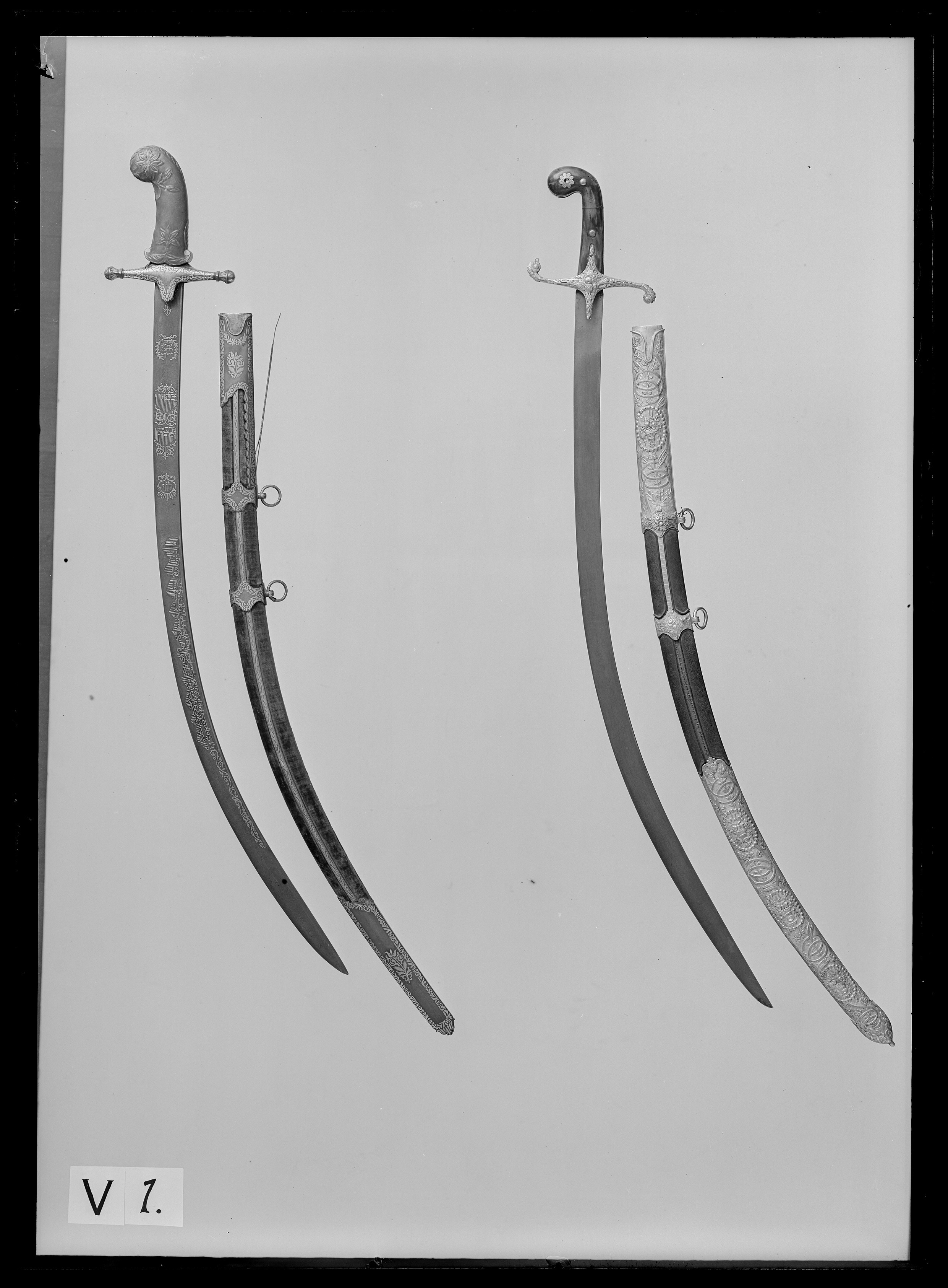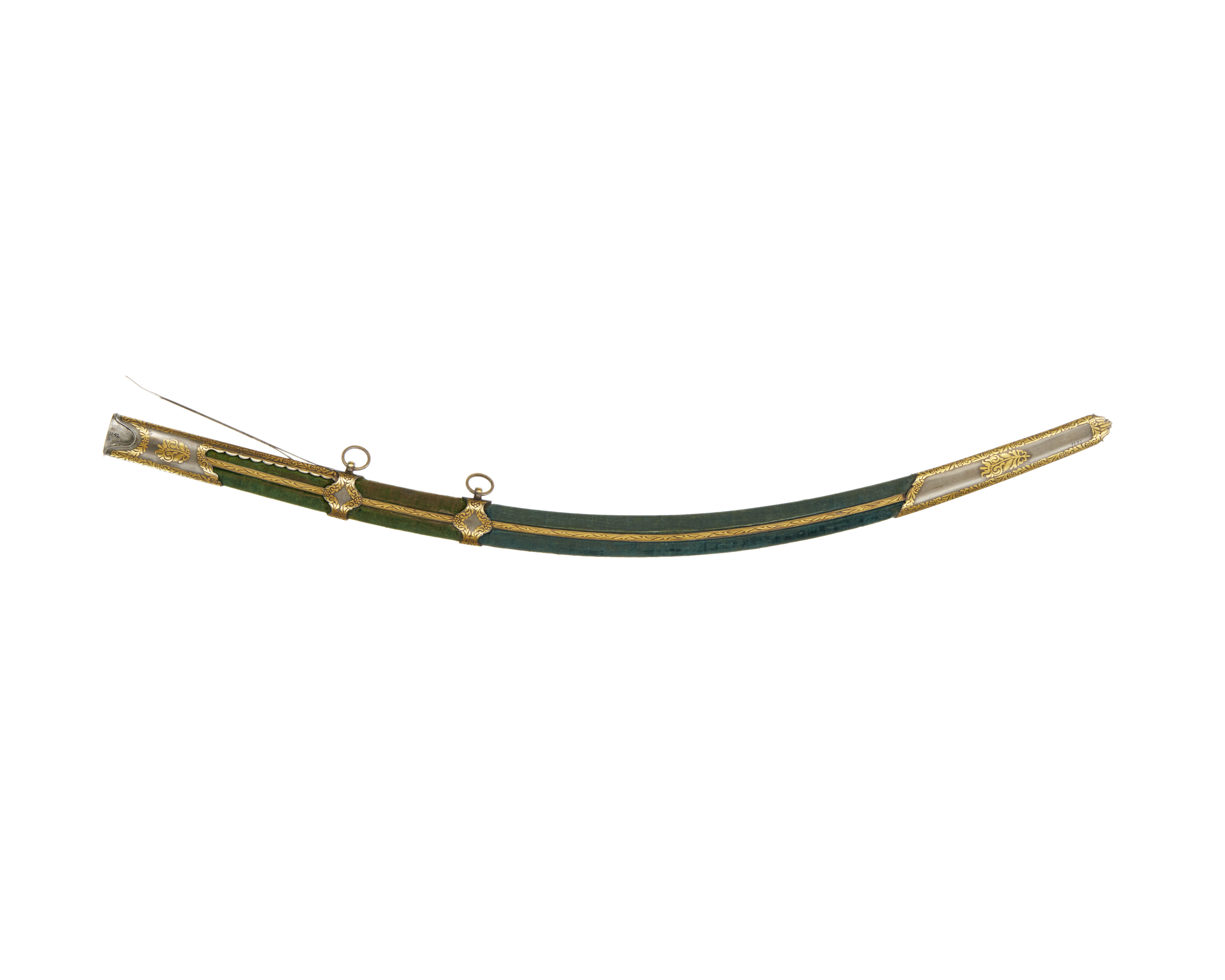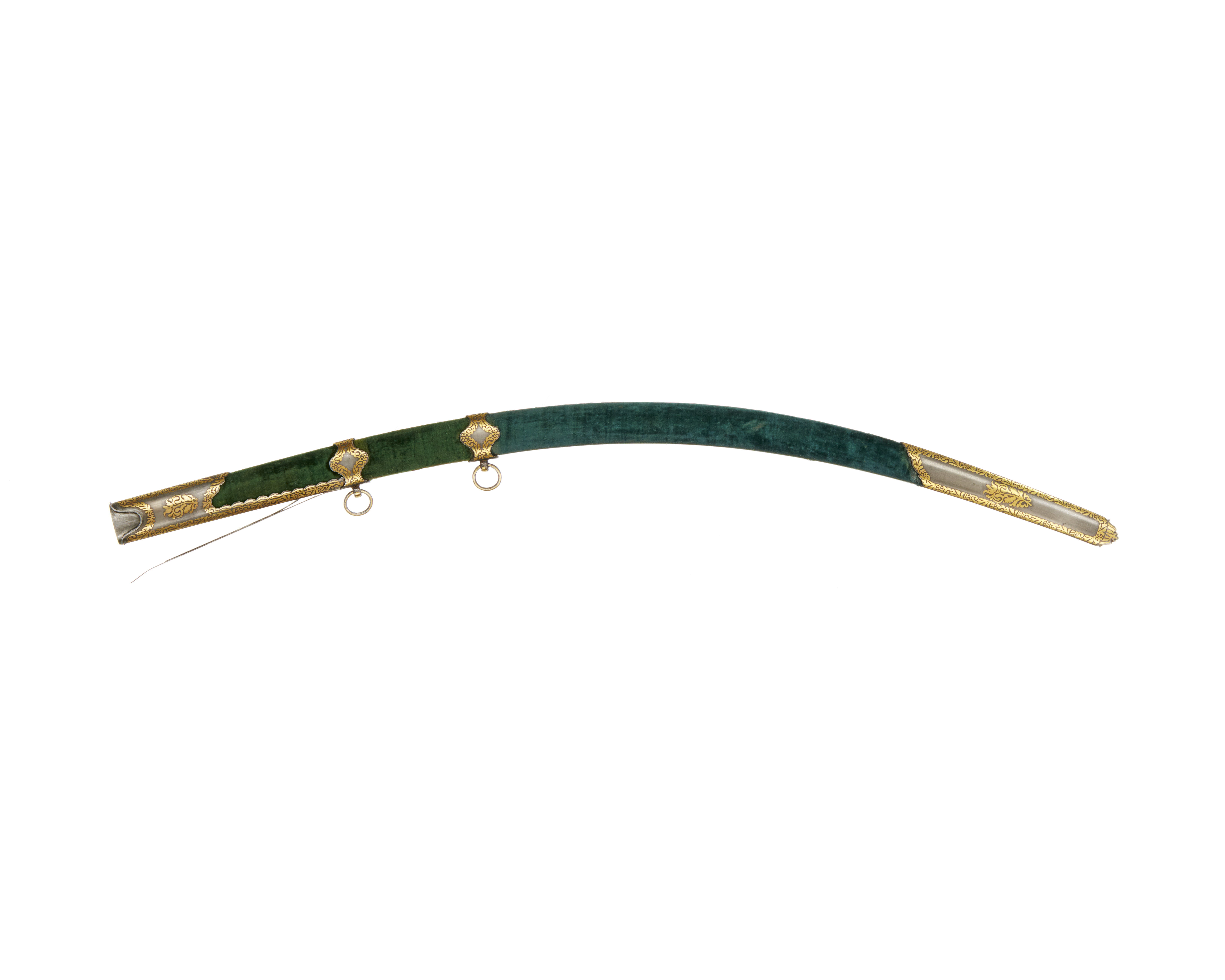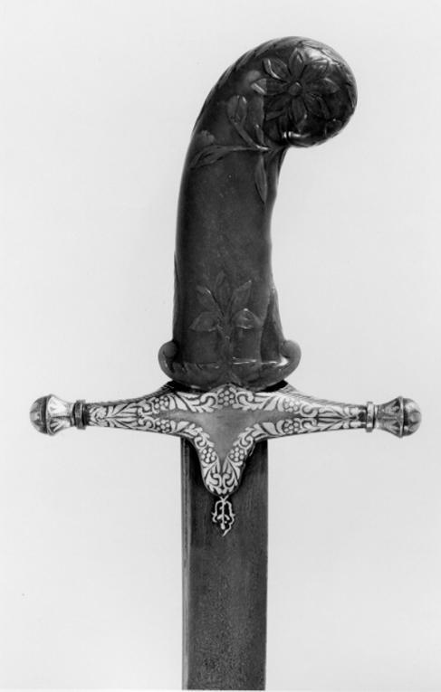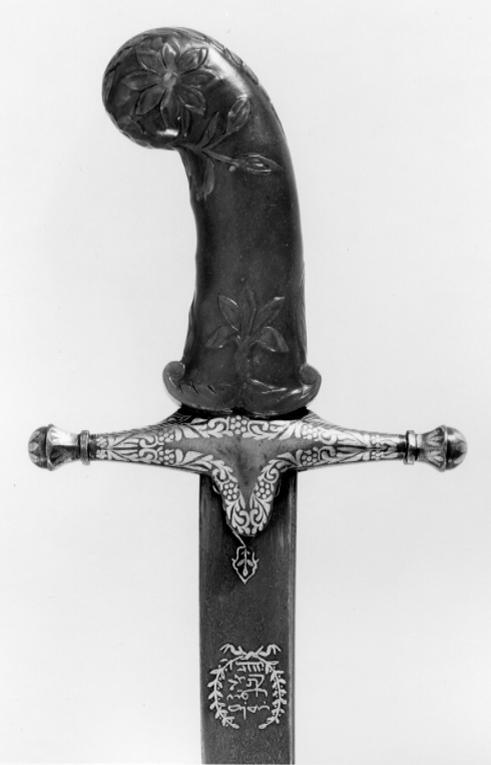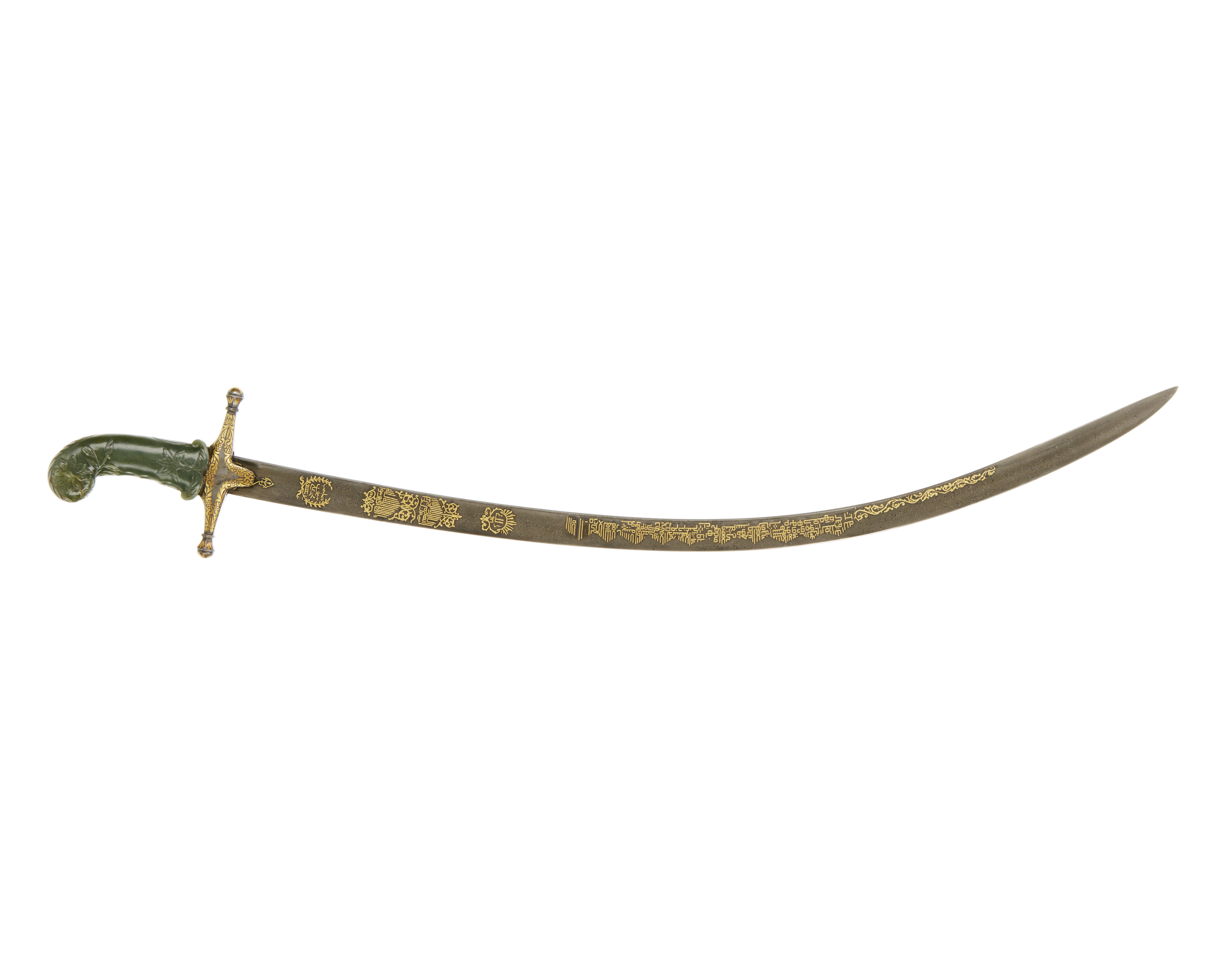 Fäste av jade upptill övergående i en framåtböjd, utsvälld kappa med snidade blommor och bladrankor. Raka parerstänger med tjocka ytterändar, sexkantiga, samt på båda sidor, vid krysset en nedåtriktad styrskena. Utmed kanten av styrskena och parerstänger samt på undersidan rankbård av påslaget guld. Klinga, damaskerad, böjd eneggad utom vid det 165 mm långa tvåeggade spetspartiet. Något förtjockas ryggparti samt med dekor av påslaget guld. Vid basen på båda sidor lika dekor av rankor, därefter på utsidan öppen bladkrans inneslutande skrivtecken. Därefter grupper av kaballistiska tecken och skrivtecken (se katalogkort) avslutat mot spetsen med en bladranka utmed ryggsidan. Insidan utan dekor. Tillbehör: Handrem (portepé) av vävt svart silkegarn och guldtråd med lekare och en tofs av guldbuljoner och i mitten flätat silkegarn.